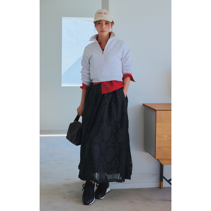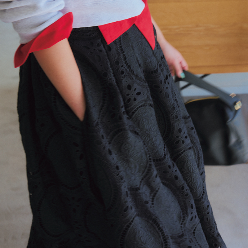 レーススカートはシックな黒を選ぶとテイストミックスしやすい。