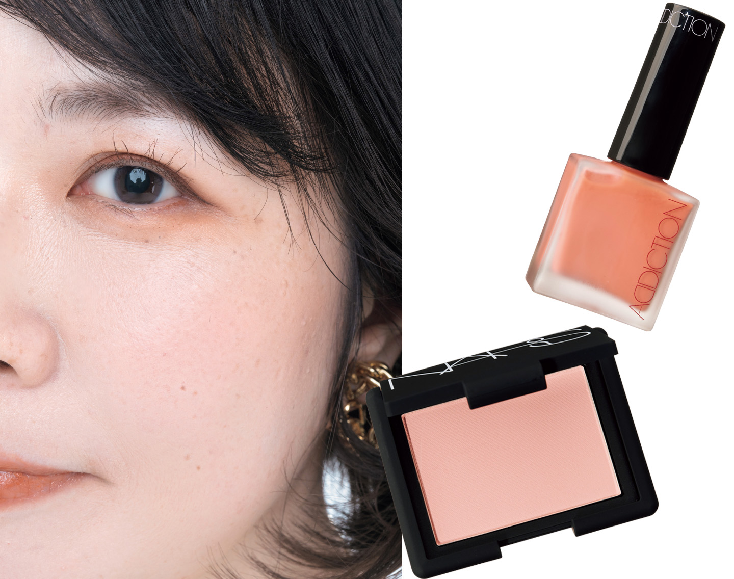 リキッドファンデにリキッドチークを混ぜてシミが気になる頰に横広に塗布。同じ位置にブラシで仕上げのパウダーチークを。上:チークポリッシュ 11 ¥3,080(ADDICTION)下:NARSブラッシュ 4033 ¥4,730(NARS)