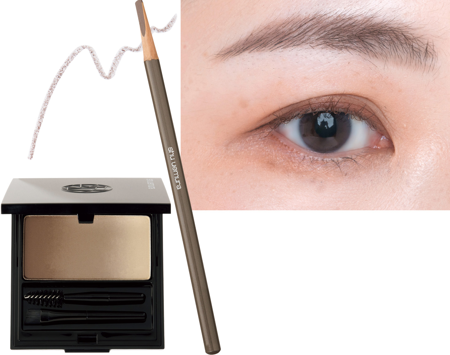 眉中央から眉尻はペンシルで毛を足すように。その後、パウダーで眉尻→眉頭の順に平行を意識しながら描く。左:ブローシェーダー ウォーム ¥6,380、右:ハード フォーミュラ シール ブラウン ¥3,630(ともにシュウ ウエムラ)