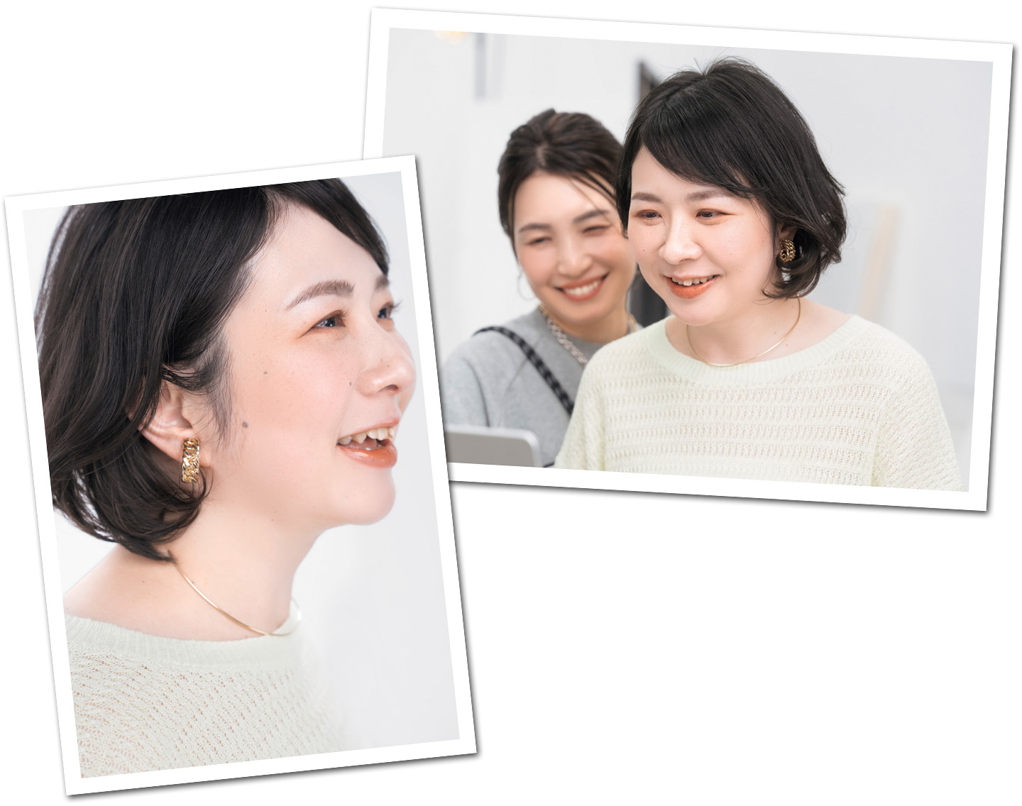 いつも不安そうに見える表情と言われますが、撮影後に写真をチェックさせてもらったら、楽しそうな笑顔の自分に感激しました!