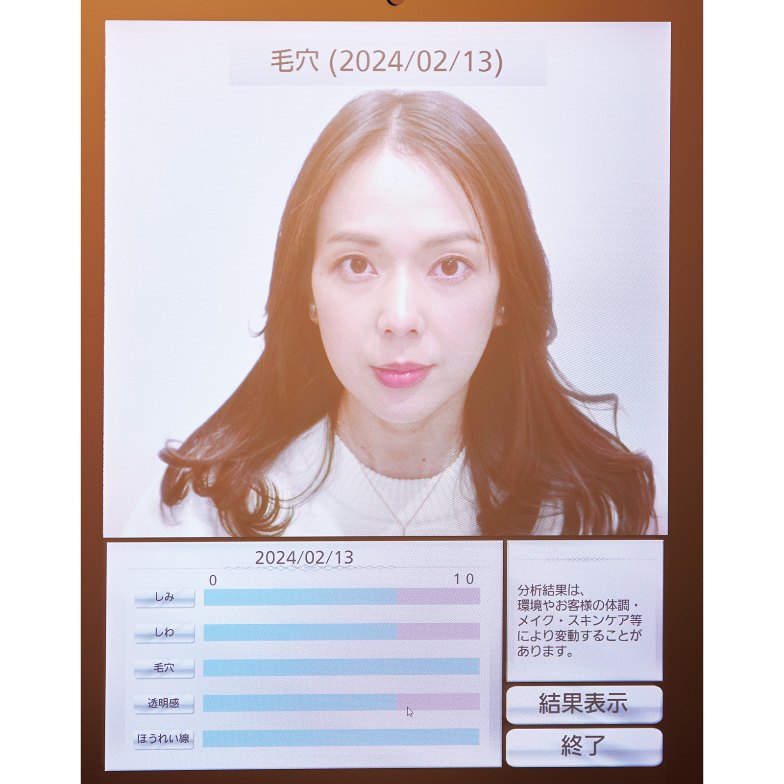 パナソニック独自の肌分析装置「スノービューティミラー」で肌状態を診断。隠れたシミやシワも可視化して肌状態を分析します。