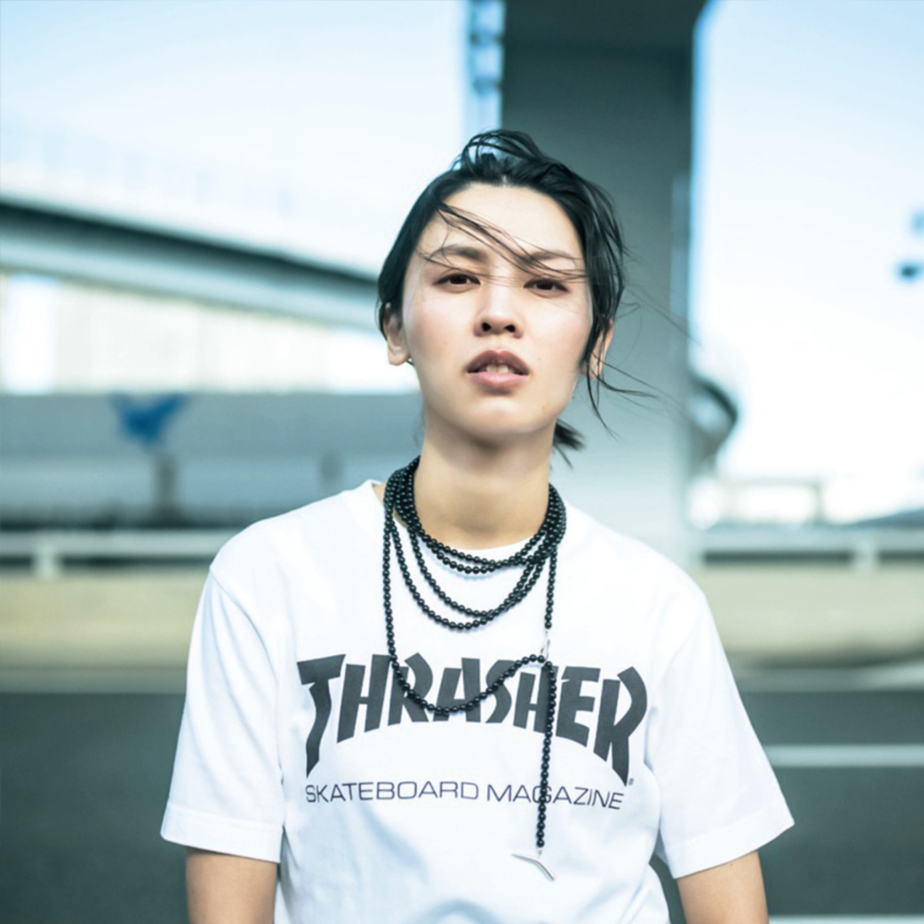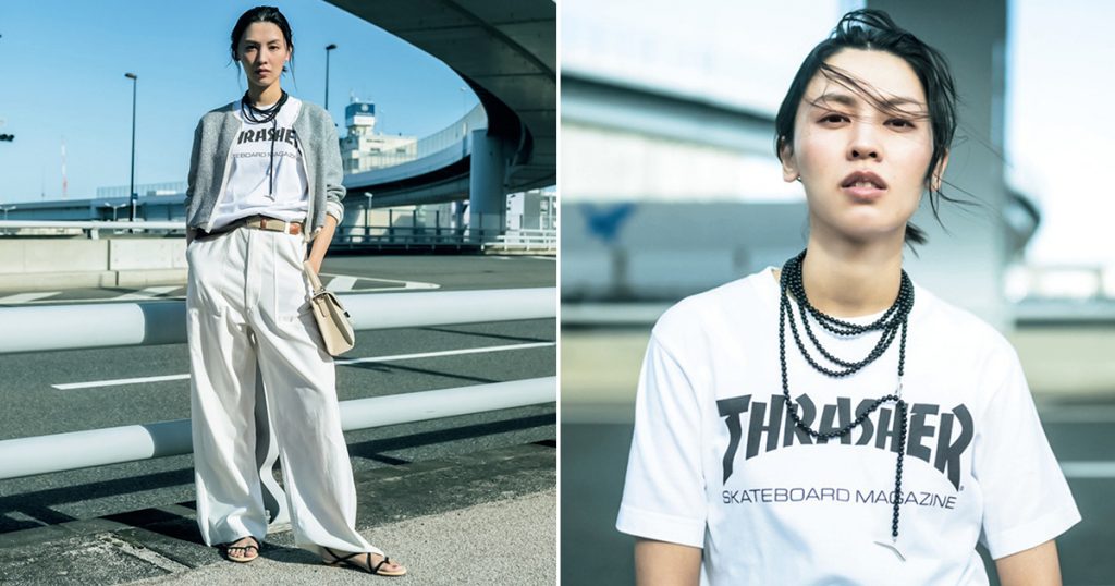 1981年創刊のサンフランシスコ発のスケボー専門誌『THRASHER MAGAZINE』。「ロゴのフォントもデザインも好き」と美恵さん。コンサバ寄りのノーカラージャケットや白パンツに効かせてギャップのある着こなしに。