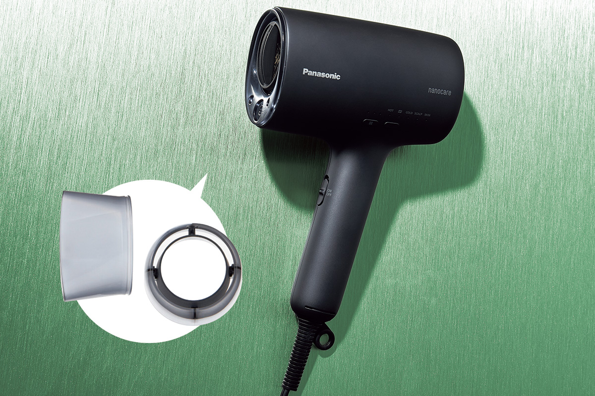 水分発生量が従来の18 倍の高浸透ナノイー。髪にうるおいとなめらかさを。キューティクルの密着性を高めるミネラルマイナスイオンでカラーの退色も防止。(左・セットノズル。右・毛量が多い人向け根元速乾ノズル。)
