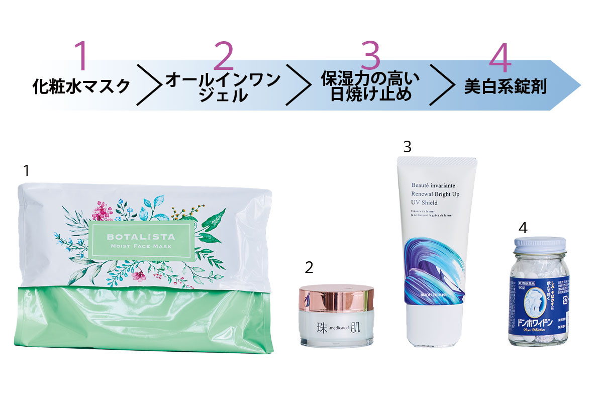 左から:BOTALISTA MOIST FACE MASKはオイルフリーなので化粧水のように使えます。毎日の水分補給に欠かせません。珠肌のオールインワンジェルはシワ改善・美白・保湿の三役。ビジュードゥメールの日焼け止めは外出しない日もマストでつけて肌を徹底防御。ドンホワィドンは顔だけではなく全身のシミ予防のために。