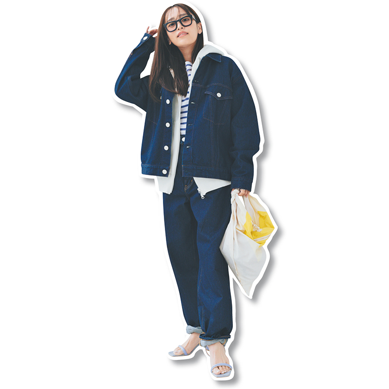 ジャケット¥30,800 デニム¥16,500〈ともにニードバイヘリテージ〉カットソー¥13,200〈ルミノア〉(すべてゲストリスト)ジップパーカ¥33,000(エイトンステイプルズ)メガネ¥47,300(モスコット/モスコット トウキョウ)バッグ¥17,600(メアリ オル ターナ)サンダル¥14,850(ダイアナ/ダイアナ 銀座本店)