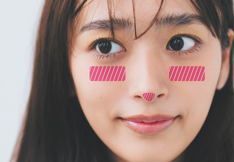 「涙袋の下の位置にチークを指で横長にのばし、余ったチークを鼻先にも置くと顔が短く見えます。右下のアイシャドウを眉下まで広げ単色で仕上げた目元、ツヤ出しの透明リップでナチュラルな印象に」(桑野さん)