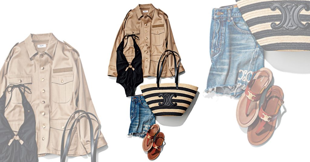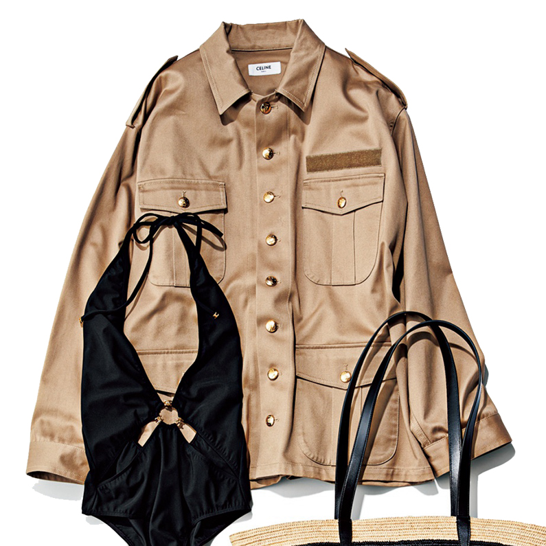 バカンスの開放感を高める、大胆なカッティング&ホルターネックのスイムウェア。ゴールドボタンが艶めくキレイめジャケットを羽織れば、ビーチサイドのカフェやショッピングシーンにも対応するスタイルに。デニムショーパンに臆せずトライできるのもリゾートの特権。せっかくなら、非日常を味わいたい。