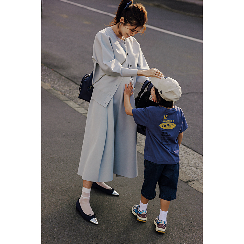 ワンピース¥15,000 カーディガン¥11,000(ともにプラステ)バレッタ¥7,700(シー/エスストア)ピアス¥41,800(コールムーン/ショールーム セッション)バッグ¥14,300(ユナイテッドアローズ/ユナイテッドアローズ 六本木ヒルズ店)ソックス¥2,090(デミルクス ビームス/デミルクス ビームス 新宿)パンプス¥11,550(ル タロン/ル タロン 有楽町マルイ店)【KIDS】Tシャツ¥5,940(ラユット × こども ビームス/こども ビームス)パンツ¥3,740(ビーミング by ビームス/ビーミング ライフストア by ビームス ららぽーと TOKYO-BAY店)帽子¥4,180(ニューエラ)靴¥11,990(ニューバランス ヌメリック/ニューバランスジャパンお客様相談室)ソックス/スタイリスト私物