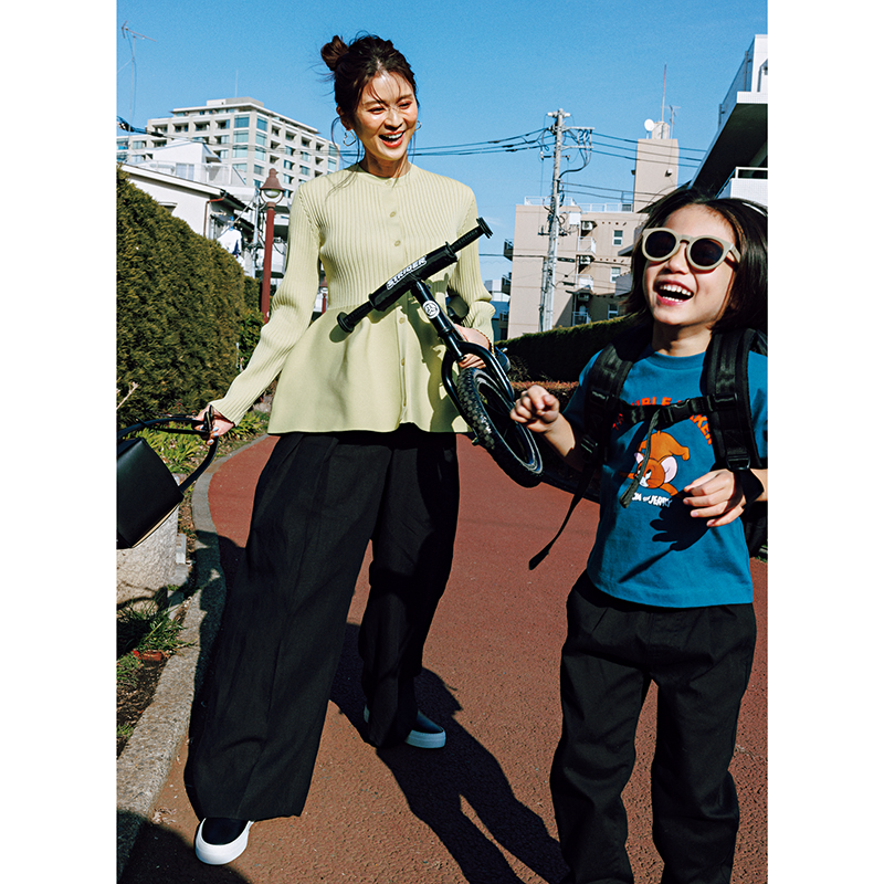 ニット¥12,100(ミラ オーウェン/ミラ オーウェン ルミネ新宿2店)パンツ¥42,900(サクラ/インターリブ)ピアス¥29,700(エナソルーナ)バッグ¥77,000(メゾン ヴァジック/ヴァジックジャパン)靴¥42,900(ペリーコ サニー/アマン)【KIDS】Tシャツ¥3,630 パンツ¥3,740〈ともにビーミング by ビームス〉サングラス¥3,630〈デリーブ × ビーミング by ビームス〉(すべてビーミング ライフストア by ビームス ららぽーとTOKYO-BAY店)リュック¥5,500(ニューエラ)