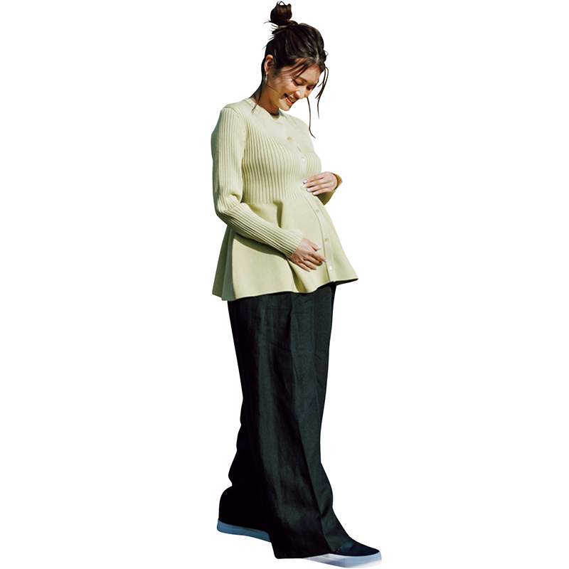 カーデとのセットアップで季節をまたいで活躍。締め付けがつらい悪阻期から選択肢が激減する後期まで寄り添って、女らしく。