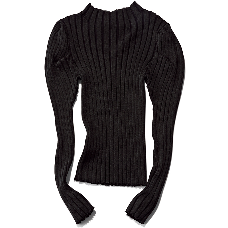 伸びのいいワイドリブと構築的なフォルムで二の腕やバストもカバー。ほどよくシアーでラメ感もあり、華やかに。