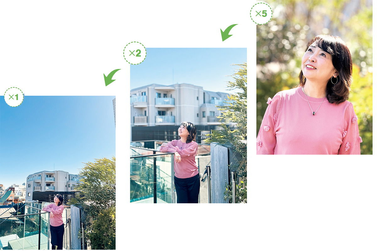 倍率アイコンでズーム切り替えが可能。初めにグッとズームし撮る角度を決めてから倍率を下げていくと、丁度いい遠近感とバランスが見つかります。インスタでは背景多めの方がオシャレ印象に。
