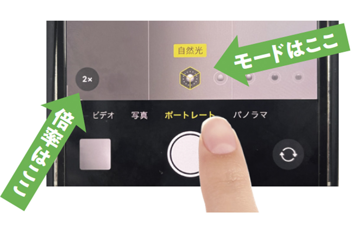 iPhoneの場合はこれがオススメ。被写体を際立たせた一眼レフカメラのようなボケ味でオシャレ感が増します。照明設定は自然光でナチュラルな仕上がりに。