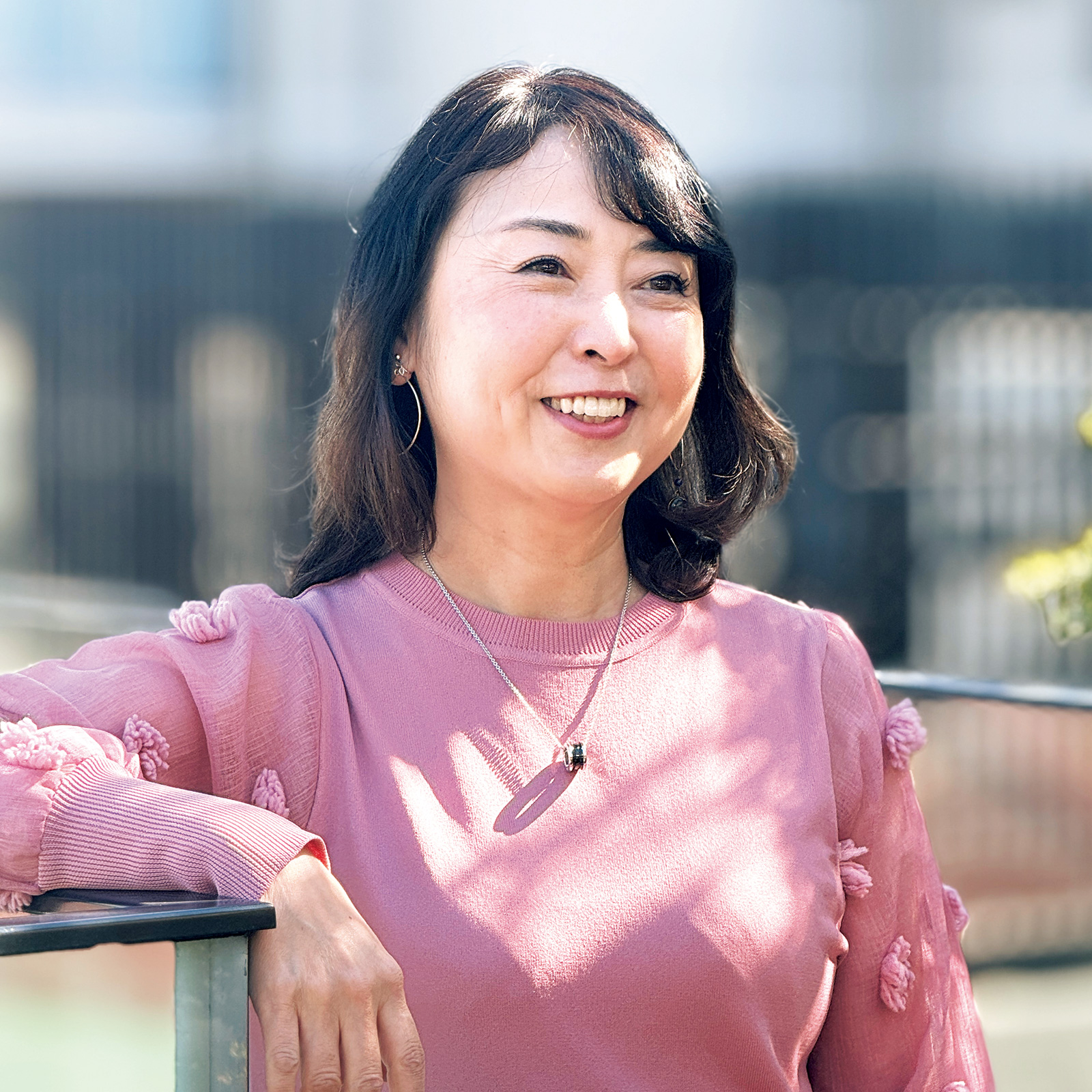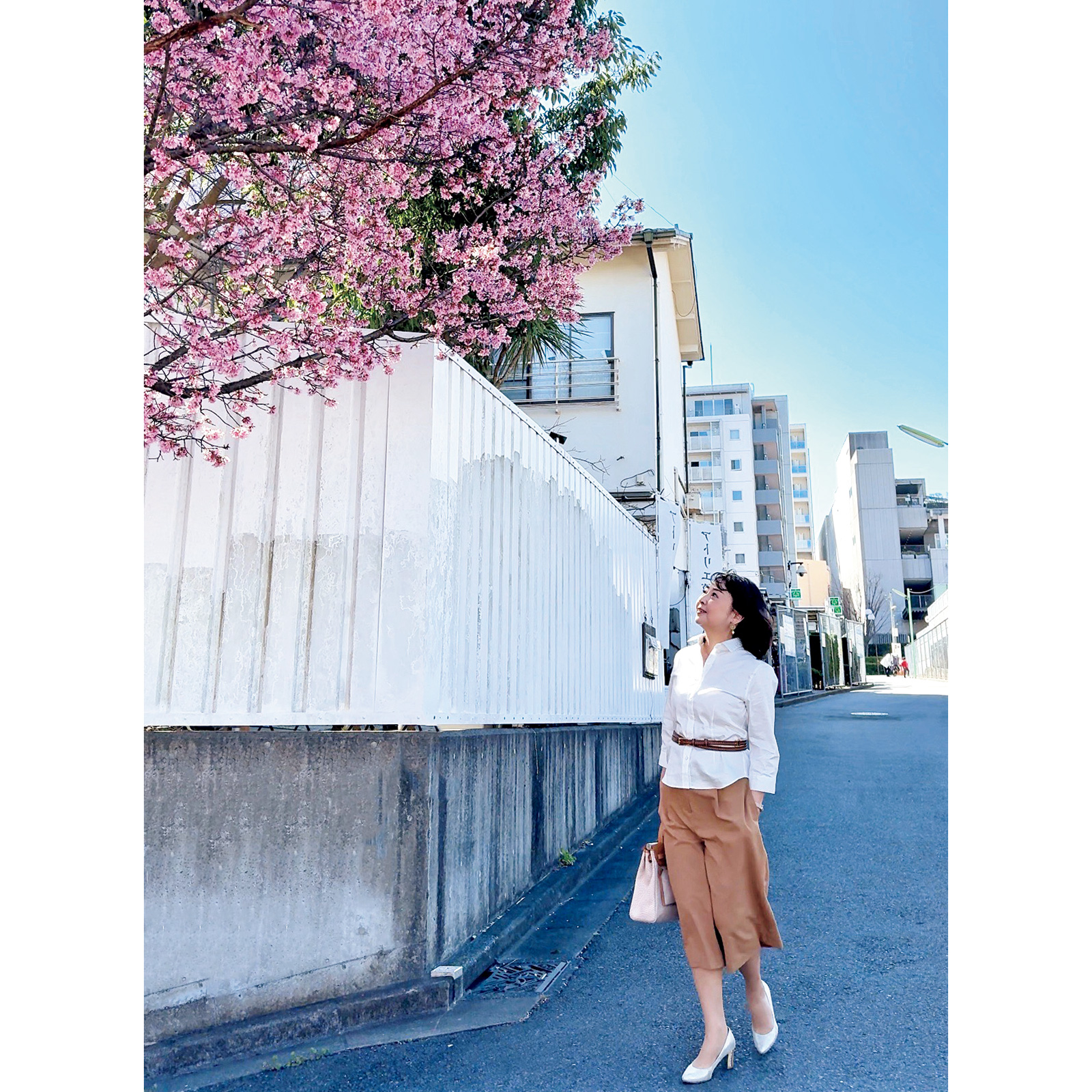 ばっちりカメラ目線は記念写真感強め。遠くを見るように視線を上下や前後左右で動かすと自然に。手を前で重ねて組むのはやりがちNo.1ですが、固まってしまうので、顔近くにする、何かに置くなどを。