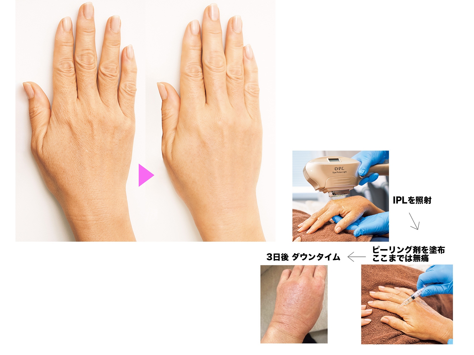 光治療後にピーリングを。「シミ取り中の痛みはありませんが、直後は赤みが出て濃くなったように感じました。3日後くらいから腫れて痛みや痒みが1週間ほど続き、塗り薬で鎮静。手はやはり日常的に動かすので大変でした。ゴルフや車の運転でできた手の甲のシミが浮き出し1週間ほどで剥がれてキレイに」美STライター・森島千鶴子(57歳)