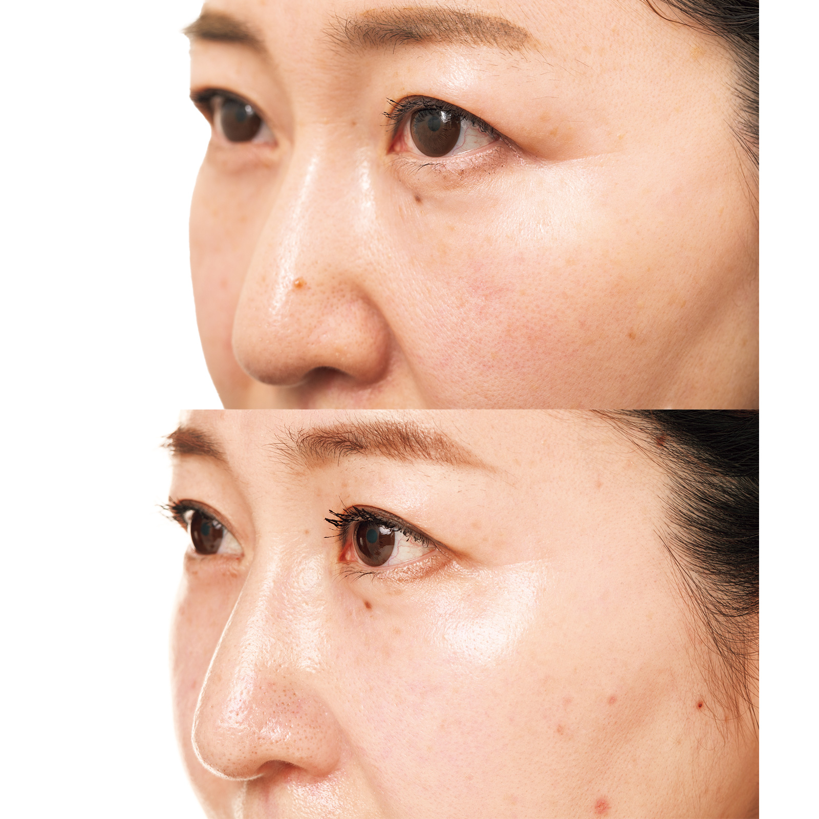 レーザーで治療。「施術中は顔を輪ゴムで弾かれるような痛みがあり、ヒリヒリした感じが夜まで続くも翌日には落ち着きました。今後またシミ取りにトライしてもいいかもと許容できるくらいの痛み。目元が一気に明るくなりました!」美STライター・大佛摩紀(59歳)