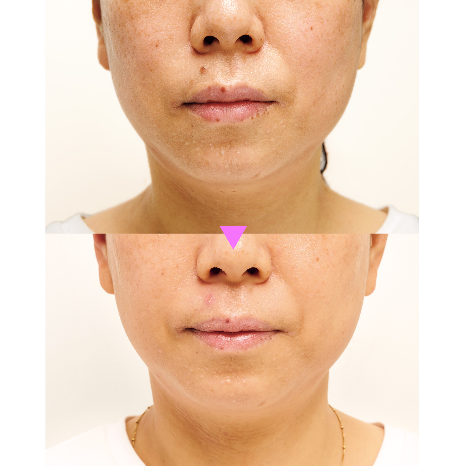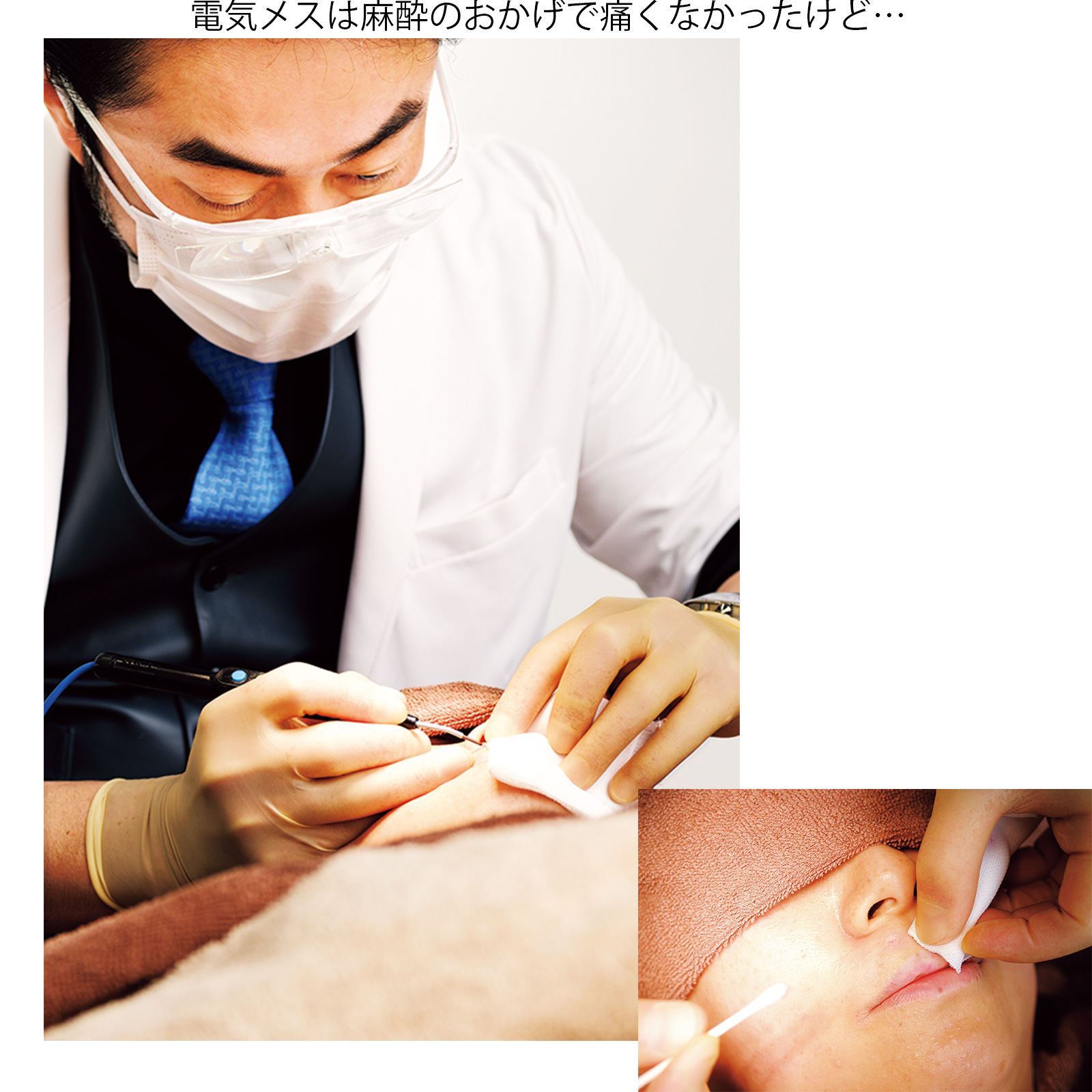 鼻下のホクロは電気メスを使用、他はピコレーザーで治療。「鼻下は麻酔で痛みはなかったですが、目元は奥まで響く感じが。唇は夜にかけ歯科の麻酔に痛さが伴うようなイメージでジンジンじわじわと痛く、帰り道の駅の階段を上りながら弱気になったほど。でも、その後会った人に印象が別人級と褒められたこともあり、後悔していません!」美STライター・大山真理子(46歳)