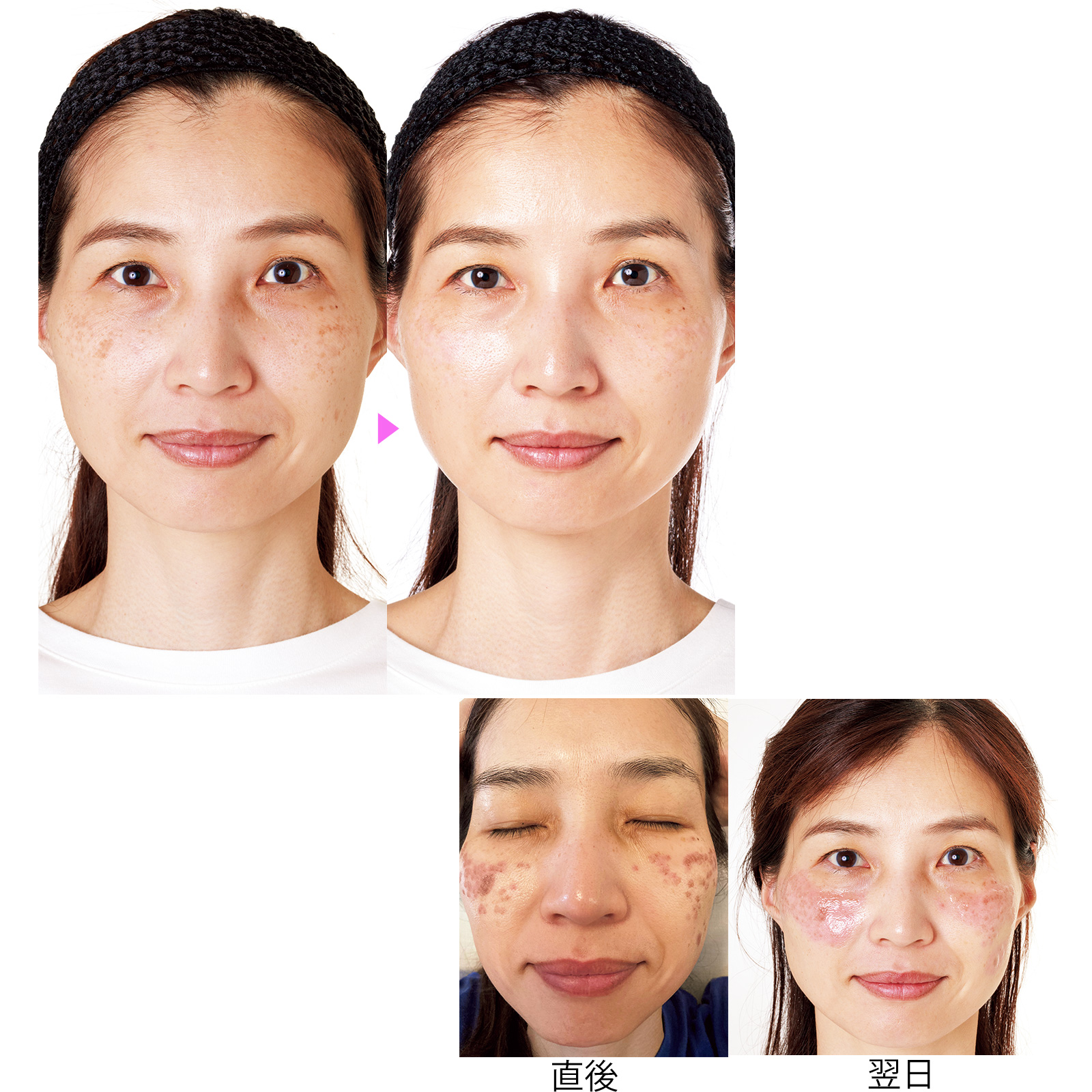 レーザーで治療。「施術開始よりジリジリとした感覚が顔全体に。施術が進むにつれさらにありました。夜まで腫れていていつもと違う熱っぽさを感じましたが、眠りにつくことはできました。翌日以降かさぶたになり痛みはそこまで気にならず、5、6 日目くらいでかさぶたが取れてキレイに」主婦・庄子典子さん(48歳)