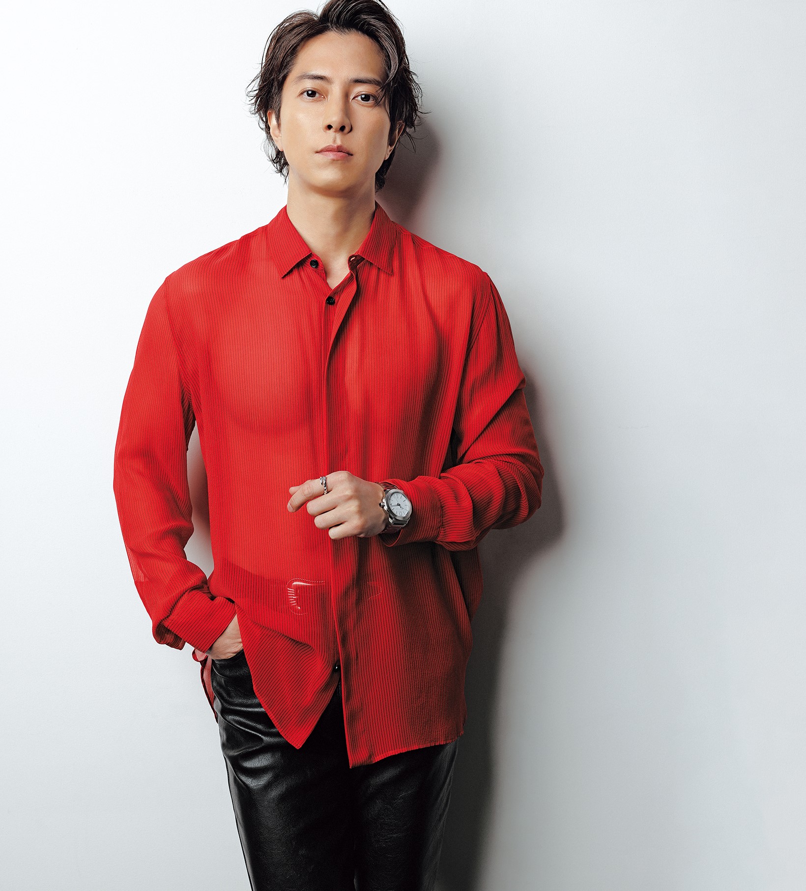 シャツ・ベルト・レザーパンツ(すべてスタイリスト私物)腕時計「オクト ローマ」¥1,056,000(ステンレススティール)リング「セルペンティ ヴァイパー」¥331,100(ホワイトゴールド)(ともにブルガリ ジャパン)