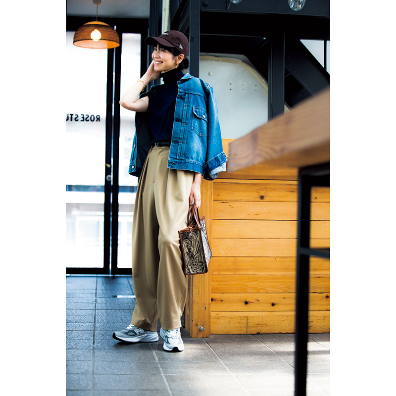 スニーカー¥36,300(ニューバランス/ニューバランスジャパンお客様相談室)ニット¥25,300(ebure/ebure GINZA SIX店)デニムジャケット¥39,600(HYKE/ボウルズ)パンツ¥30,800(ウィム ガゼット/ウィム ガゼット 玉川髙島屋S・C店)ベルト¥9,900(ユナイテッドアローズ/ユナイテッドアローズ 渋谷スクランブルスクエア店)キャップ¥4,400(ニューエラ)ピアス¥26,400(マリハ)ブレスレット¥58,300(ブランイリス/ブランイリス トーキョー)バッグ¥55,000(アヴァケーション/ノーベルバ)ソックス¥3,080(YAECA/YAECA APARTMENT STORE)