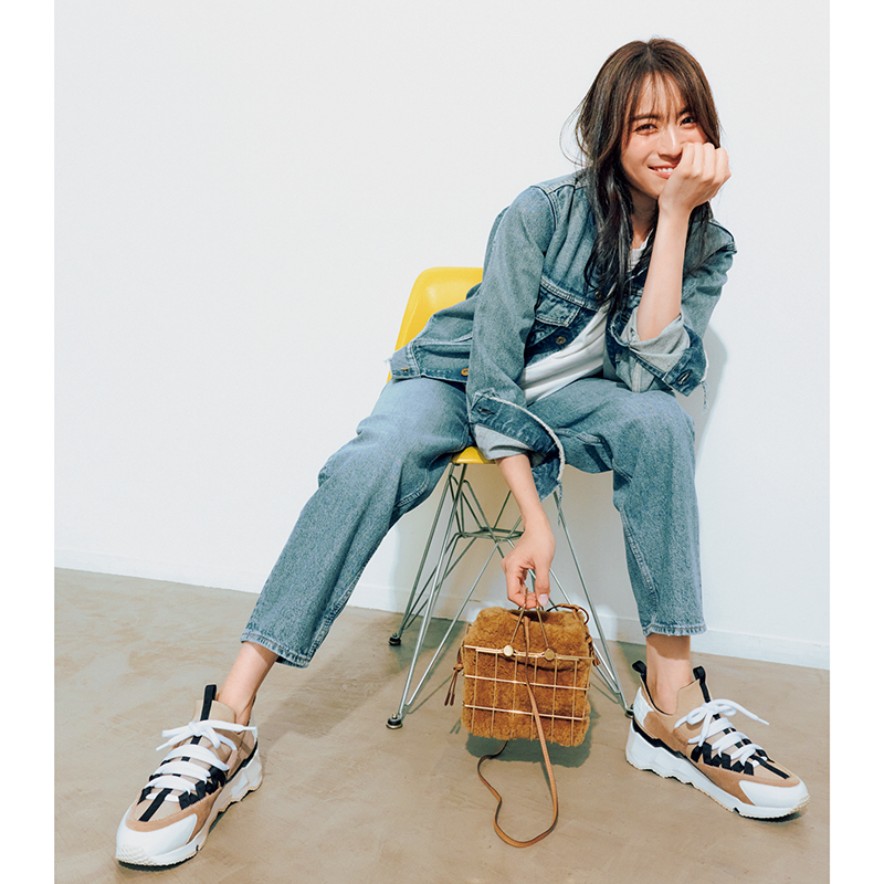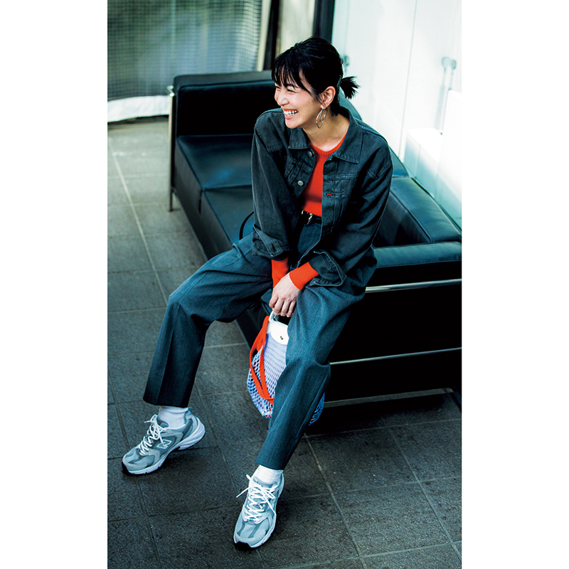スニーカー〈H=4㎝〉¥12,980(ニューバランス/ニューバランスジャパンお客様相談室)ニット¥24,200 デニムジャケット¥46,200(ともにギャルリー・ヴィー/ギャルリー・ヴィー 丸の内店)パンツ¥50,600(ATON/ATON青山)ピアス¥49,500(ブランイリス/ブランイリス トーキョー)ベルト¥27,500(ア ヴァケーション/ノーベルバ)バッグ¥22,000 中に入れたスカーフ¥46,200(ともにロンシャン/ロンシャン・ジャパン)ソックス¥1,210(靴下屋/Tabio)