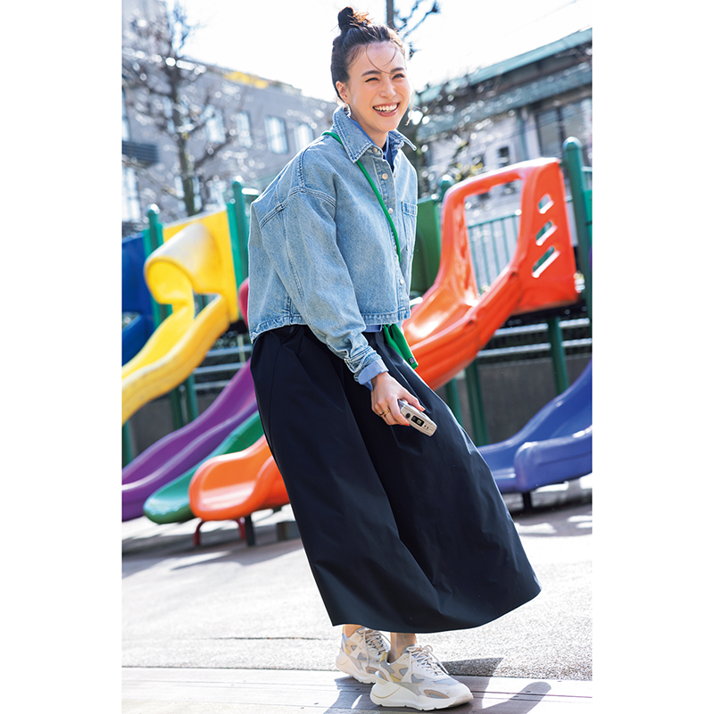スカート¥8,990(アンフィーロ)シャツ¥28,600(イレーヴ)デニムジャケット¥44,000(サードマガジン)ミニバッグ¥36,300(ステート オブ エスケープ/サザビーリーグ)スニーカー¥41,800(デイト フォー ユナイテッドアローズ/ユナイテッドアローズ 六本木ヒルズ店)リング¥17,600(ジュエッテ)
