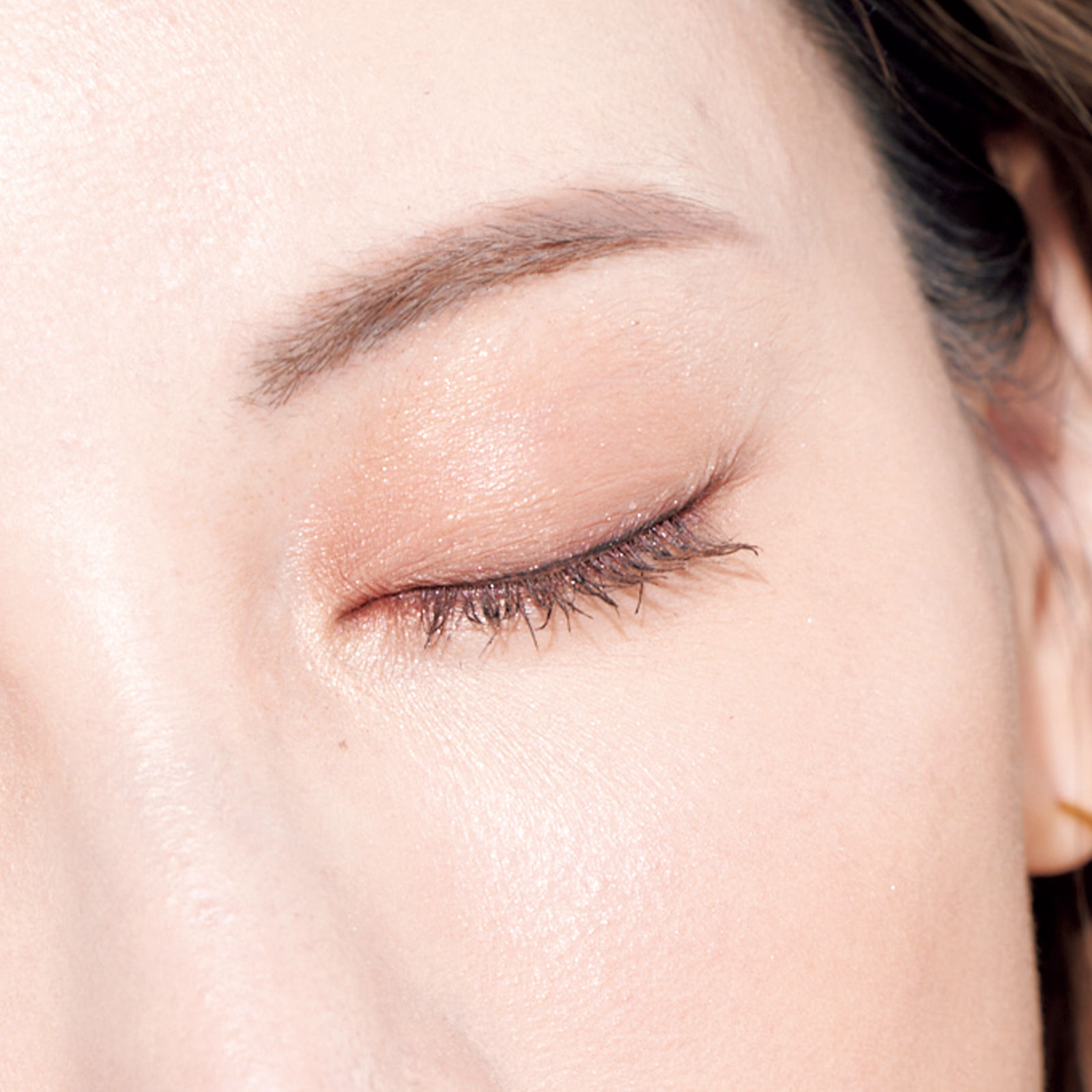 シャドウ下をアイホールと下まぶた全体に入れ、シャドウ中を黒目の下に。デジャヴュのクリームペンシルで極細ラインを目幅に引き、メイベリンのマスカラでボリュームを出して目力をオン。