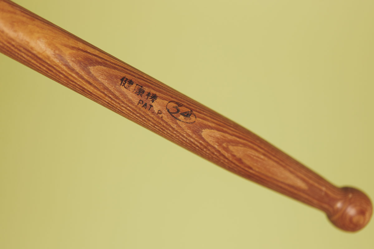 ロッキー山脈から取り寄せたというヒッコリーの木から作られたストレッチ棒。背中に回して左右に動かしたり、前方に構えて持ってスクワットをしたり、健康の要です。