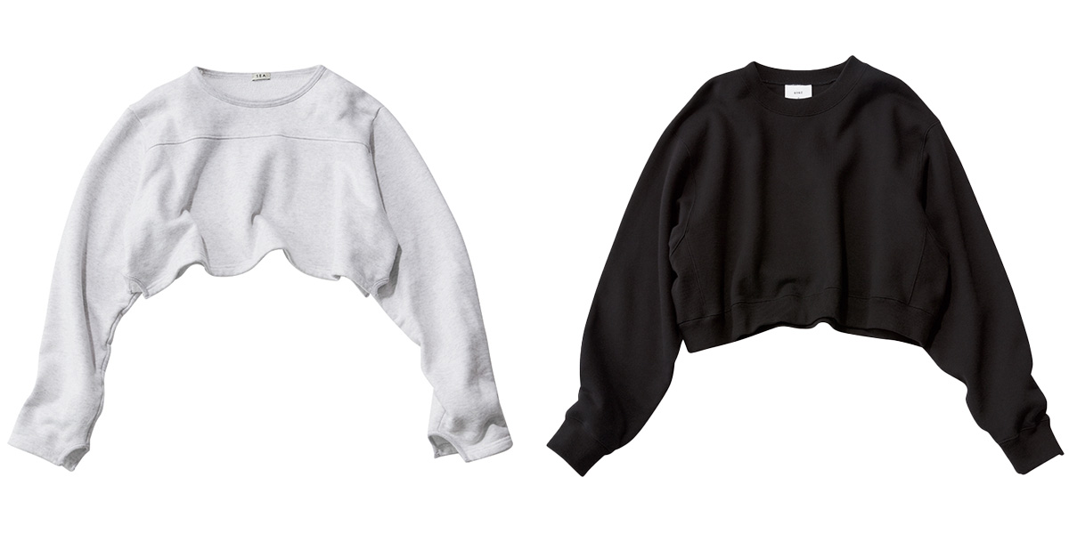 左/超ショート丈はタンクトップなどと重ねたい。スウェットトップス¥25,3 00(シー/エスストア)