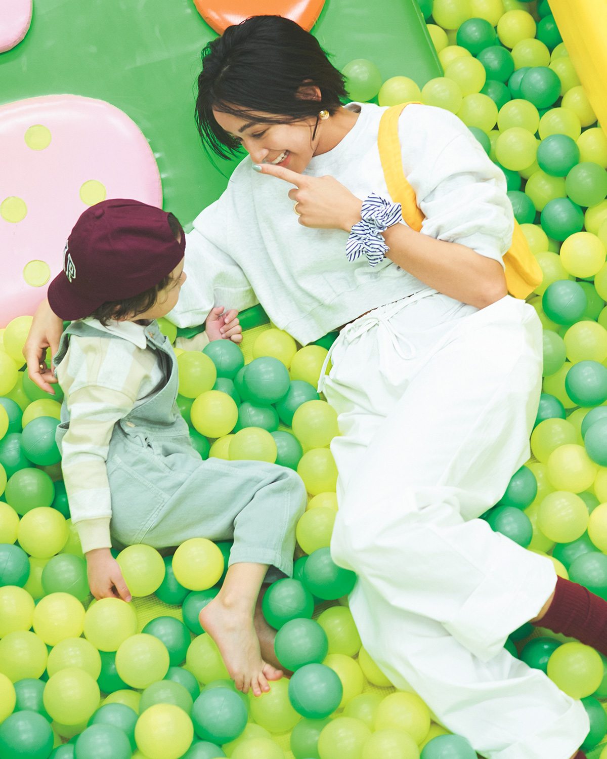 【ママ】スウェットトップス¥2,990(ザラ/ザラ カスタマーサービス)パンツ¥69,300(ヌー スイム)、バッグ¥42,900(カミング オブ エイジ/ともにRHC ロンハーマン) イヤリング¥8,800(アビステ)右手リング¥66,000、左手リング¥63,800(ともにデヴィ/デ・プレ) 手につけたシュシュ¥9,900(ジェニファー オーレット/ロンハーマン) ソックス¥2,970(アメリカン トレンチ/メイデン・カンパニー)【子ども】ポロシャツ¥4,990 キャップ¥1,990※オンライン限定(ともにベビーギャップ) サスペンダー¥3,990(ザラ/ザラ カスタマーサービス)