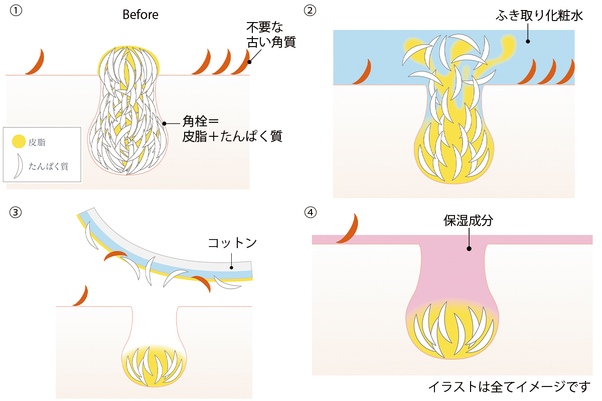 ①ケア前の肌の状態→②ふき取り化粧水が角栓にアプローチ。タンパク質の凝集が抑えられ、角栓がほぐれる。→③コットンでふき取ると、不要な古い角質、皮脂だけでなく、角栓も除去。→④保湿成分が肌の上に残る。