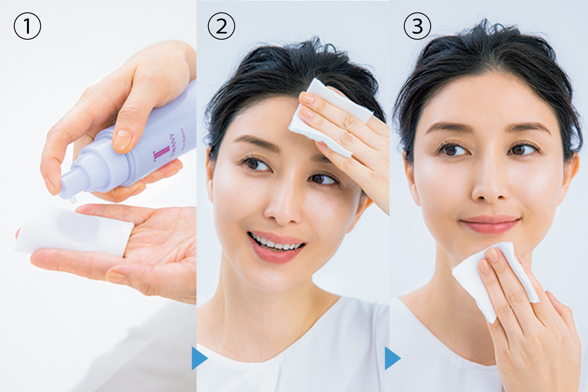 ①専用のコットン面に化粧水をポンプ2押し分(約2ml)を取り、顔全体に。