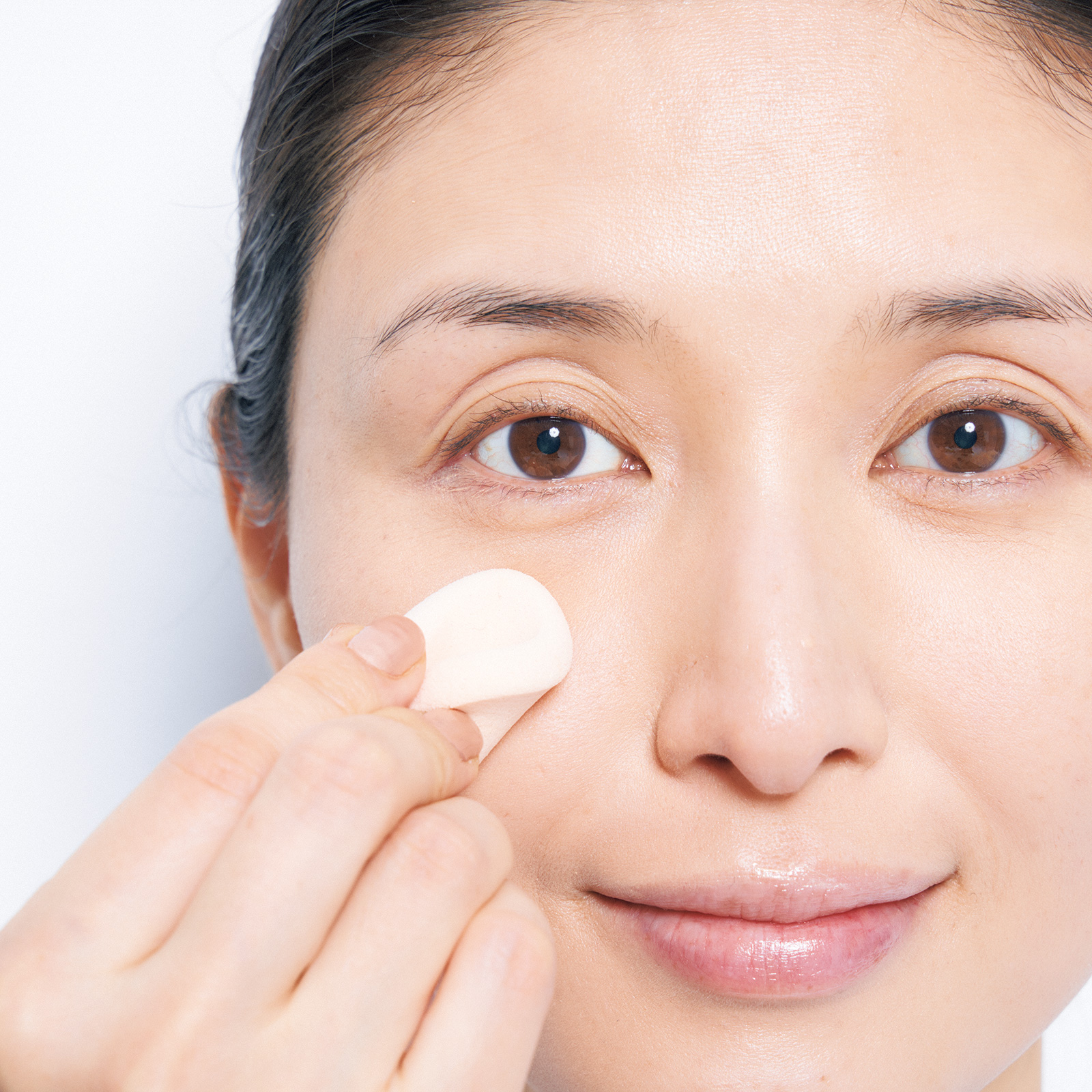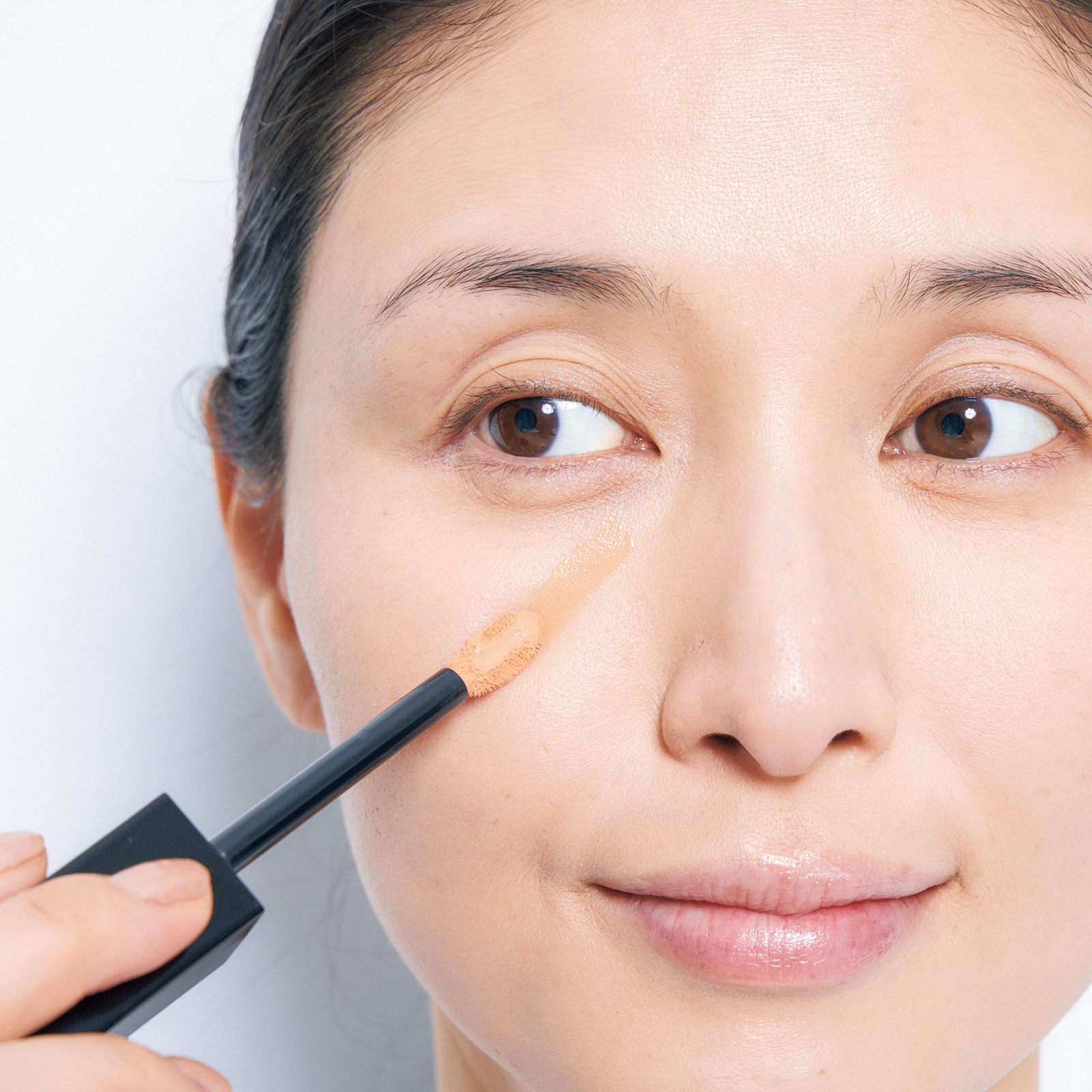 よく動いてヨレやすい目元には、テクスチャーが柔らかいチップタイプが最適。馴染みやすいから直塗りでOK。クマがある部分より少し長めに色をのせます。