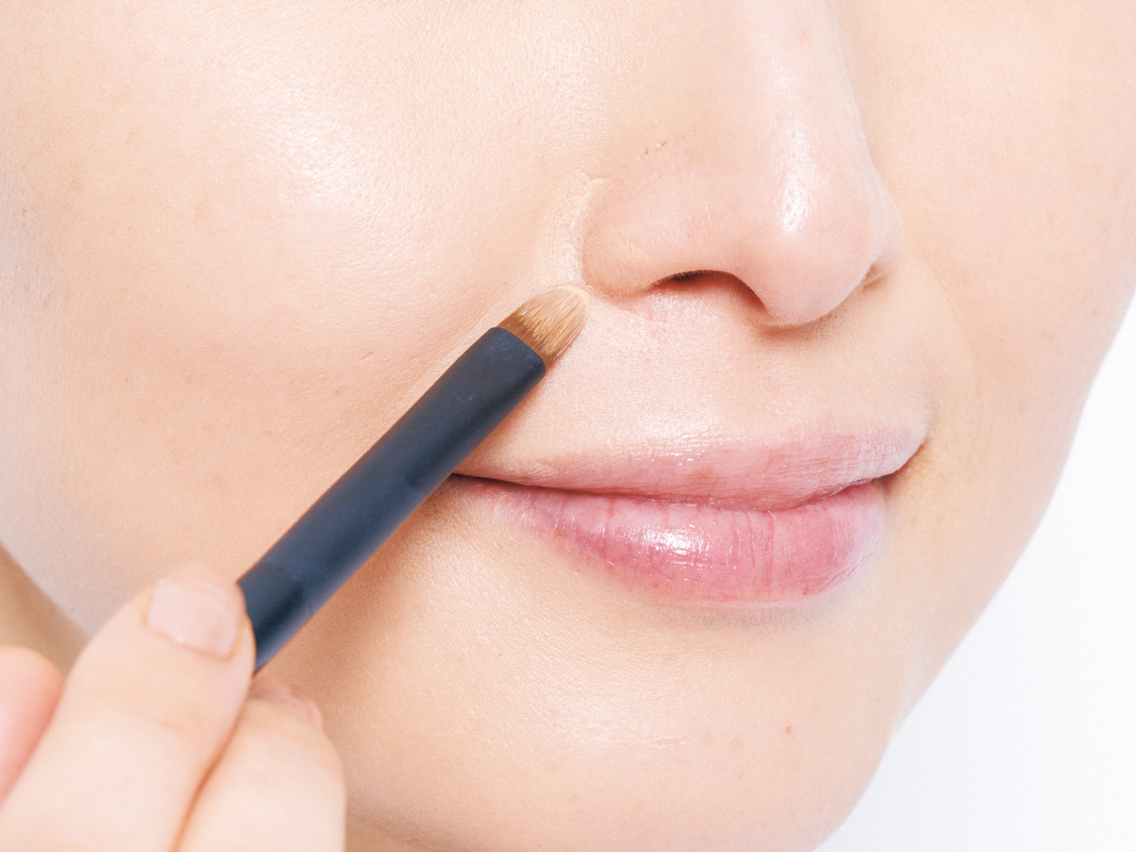 小鼻や目周りなど狭い範囲の赤みはベージュで十分カバー可能。1と2を混ぜたら赤み部分よりやや広めに色をのせ、さっと指で押さえパウダリーでフィニッシュ。