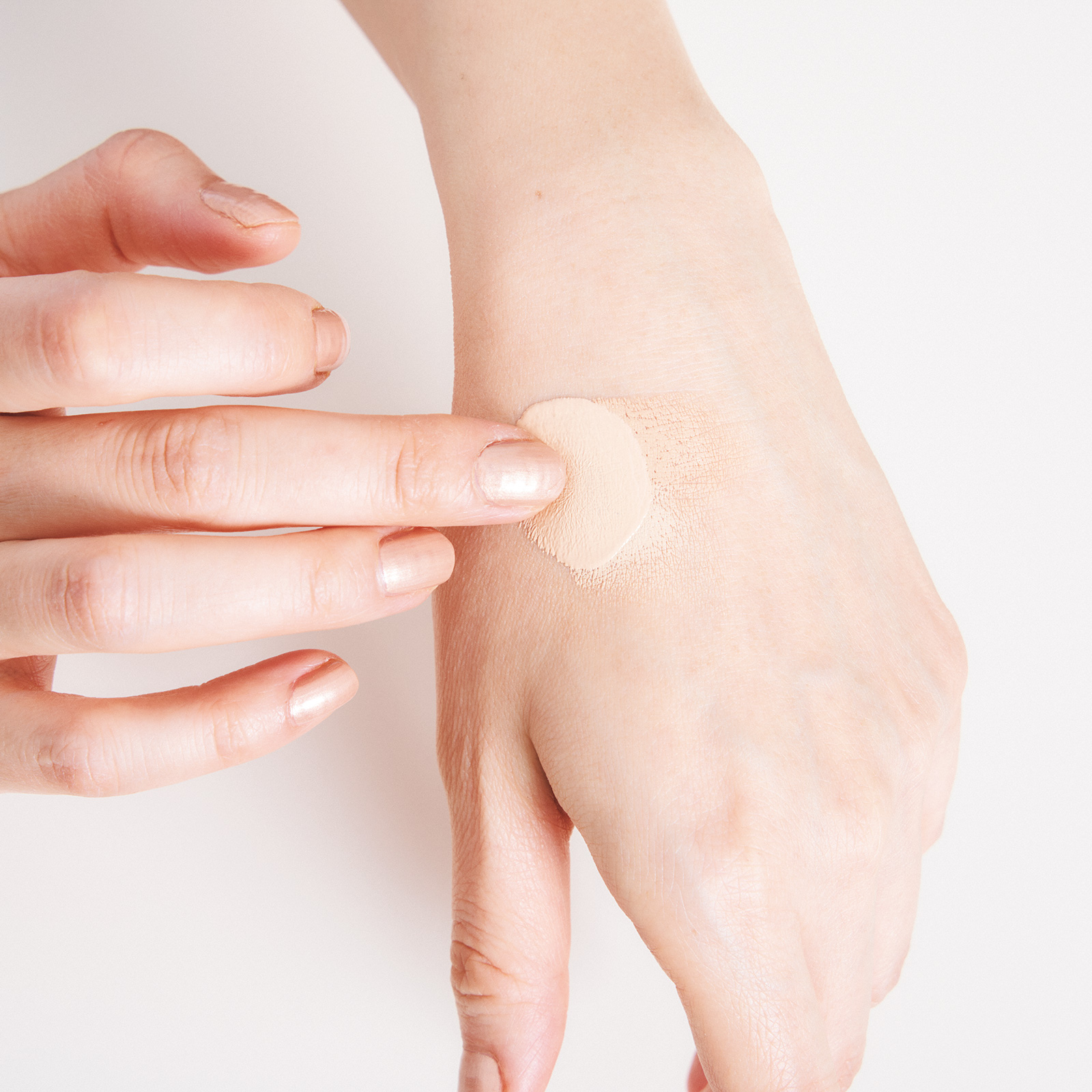 手の甲で混ぜたら手首の境目に極少量をのせ、色を合わせます。硬めのコンシーラーならその日に使うファンデを少し混ぜると、テクスチャーがより均一に。