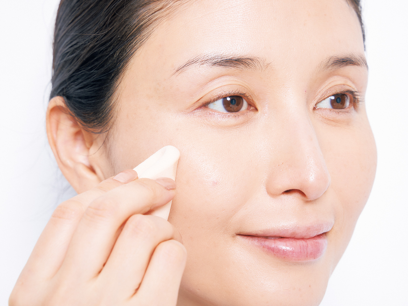 塗ったコンシーラーは、シミよりひと回り大きい範囲を目安に指でぼかします。その後、パフの先端にパウダリーファンデを少量とって押さえ、質感を整えて。