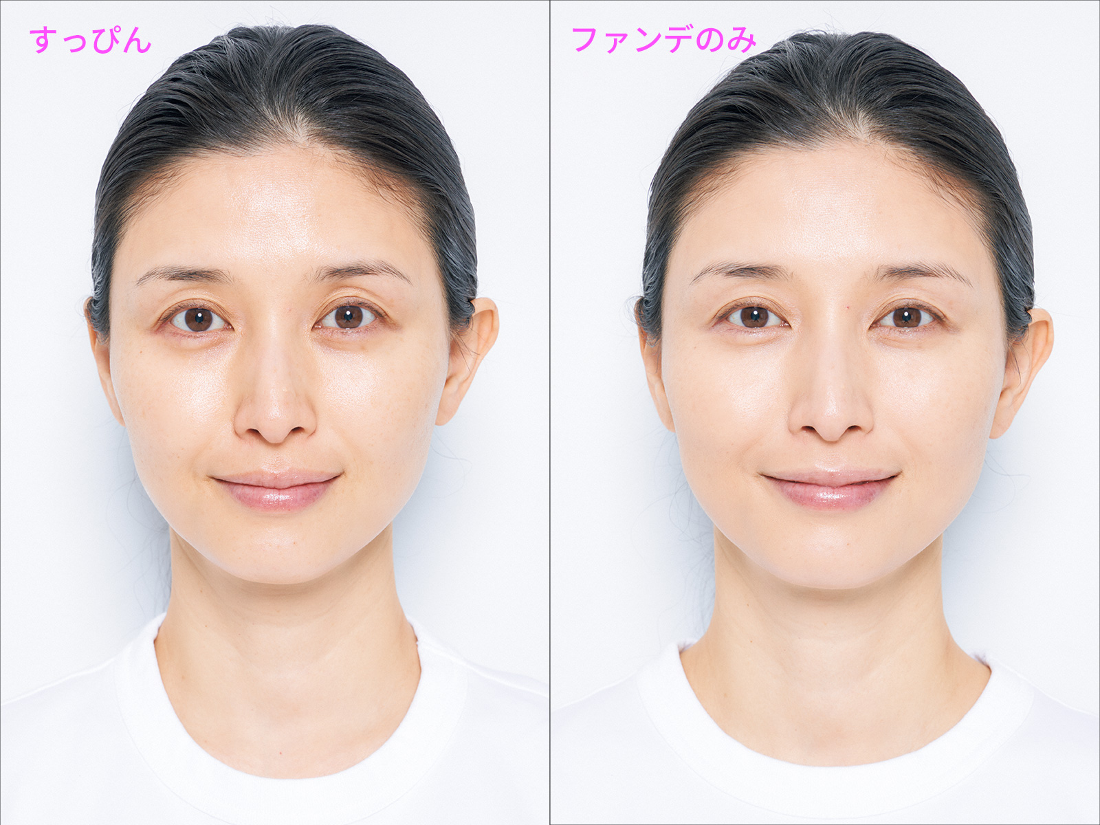 シミや影感が少ないマナミさんでも、すっぴんだとやや色ムラが。ファンデだけでもある程度は整うものの、近づくと目や口周り、頰のくすみ感が少し目立つ印象。