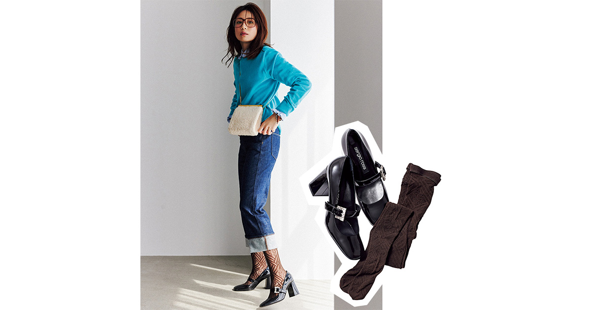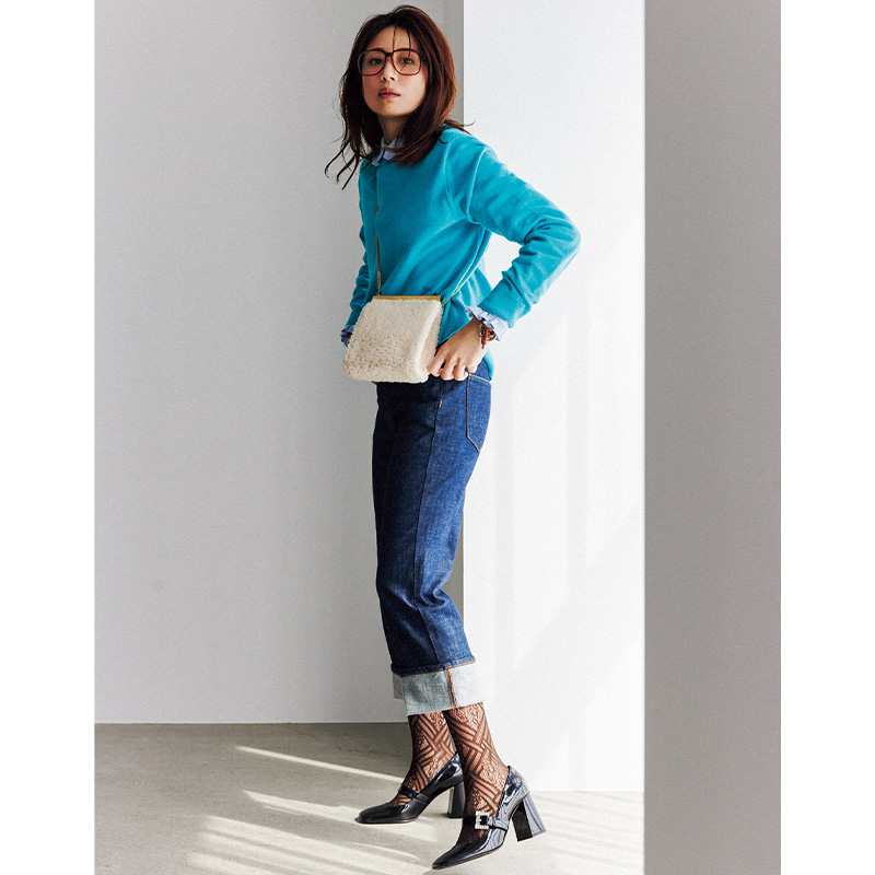 タイツ¥2,420(ぽこあぽこ)シューズ¥158,400バッグ¥137,500(ともにセルジオ ロッシ/セルジオ ロッシ カスタマーサービス)ニット¥53,900(コズ マニュファクチャード バイ ラッピンノット/ウメダニット)シャツ¥52,800(マディソンブルー)デニム¥23,100(アッパーハイツ/ゲストリスト)サングラス¥38,500(アヤメ)ブレスレット¥25,300(シーエックスシー/アマン)