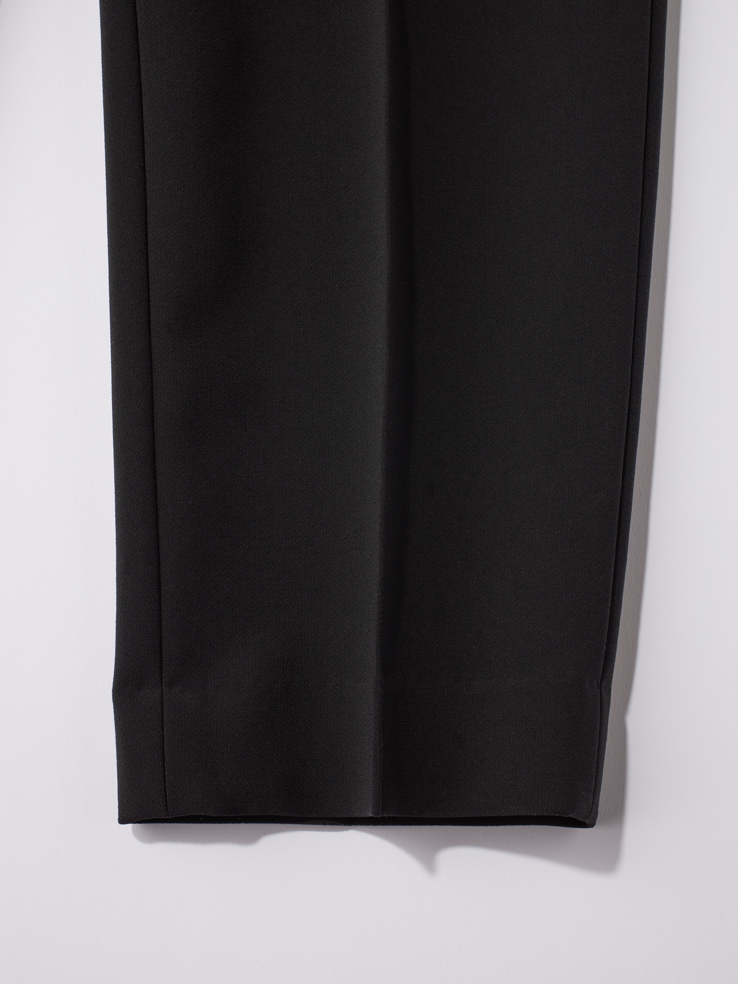 特殊なストレッチ素材を用いたコンパクトなシルエットのパンツ。ミニマムなデザインながら、シワになりづらくラインを拾いすぎずにすっきりとしたシルエットで穿けます。甘めのボリュームトップスとのコーディネートでバランサーとしても頼れるアイテム。パンツ¥24,200(TSURU By MAIKO OIKAWA)