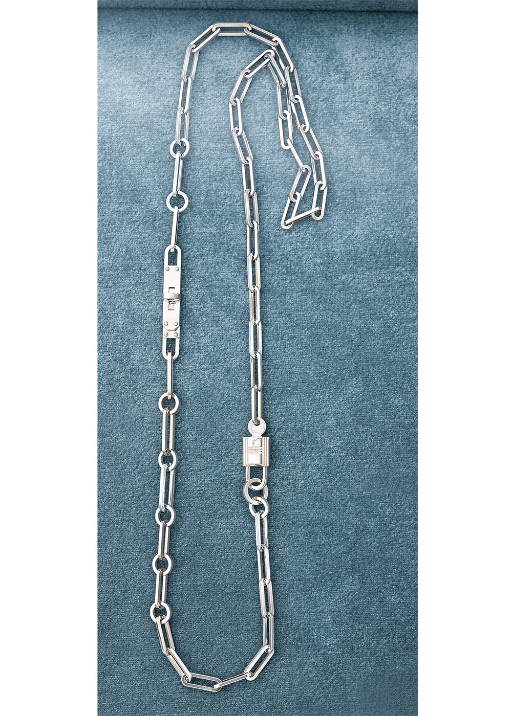 ラウンドとスクエアフォルムのリンクに、バッグ《ケリー》のトゥレとカデナが連なるモダンな印象のネックレス。メゾンのアイコンが盛り込まれた、シンプルTに映える一本です。カジュアルに使いやすい胸下丈の長さもポイント。エルメスのシルバージュエリーは、職人の手によって最終仕上げされています。「ケリー・シェーヌ」(SV/87.4cm)¥1,111,000(エルメス/エルメスジャポン)