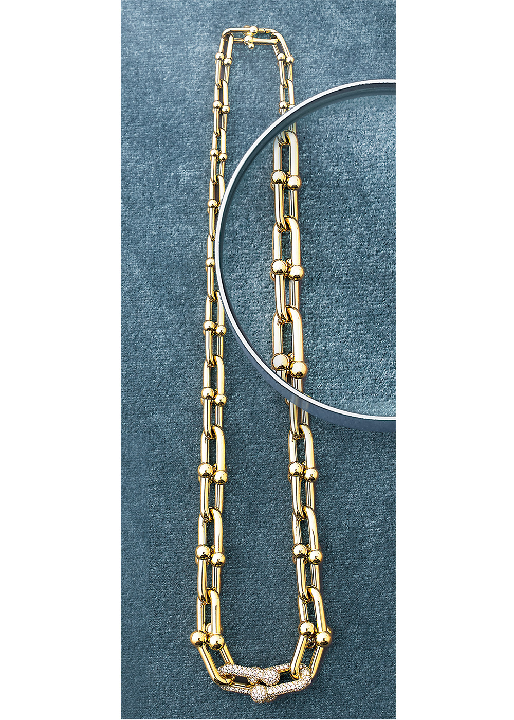 1971年のアーカイブに残るユニセックスなブレスレットから着想を得た「ティファニー ハードウェア」。中央にかけてゲージリンクの大きさが変わる大胆なグラジュエイテッド チェーンは、ハードなのに着用すると品良く見えるのが人気の理由でしょう。「ティファニー ハードウェア」(YG×パヴェ ダイヤモンド/約48.3cm)¥6,710,000(ティファニー/ティファニー・アンド・カンパニー・ジャパン・インク)