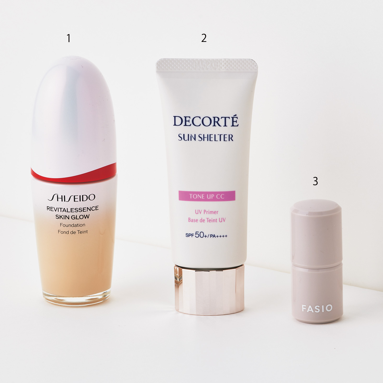 1.「長時間たっても潤い感がそのままで、ほどよいツヤ感が」エッセンス スキングロウ ファンデーション 140 SPF30/PA+++ 30ml ¥7,590(SHISEIDO)2.「肌に自然な温かみを与えてくすみが消えます」サンシェルター マルチ プロテクション トーンアップCC 10 SPF50+/PA++++ 35g ¥3,300(コスメデコルテ)3.「さりげないパール感が肌にきれいになじんでくれます」ファシオ マルチフェイス スティック 03 ¥990(コーセー)
