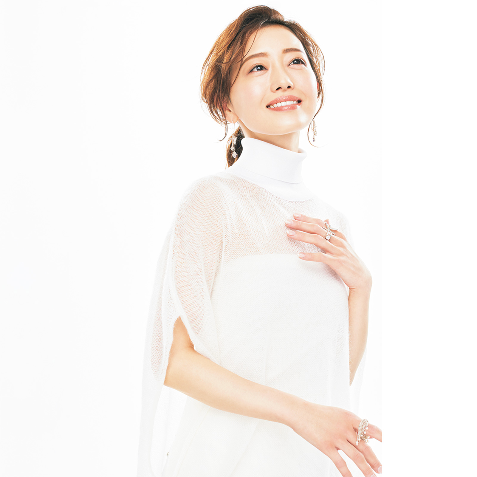 ニット¥118,800 スカート¥146,300(ともにファビアナフィリッピ/アオイ)インナー(スタイリスト私物)ロングピアス¥33,000 左手3連リング¥93,500 左手Kリング¥22,000 右手フリンジリング¥47,300(すべてイー・エム/ e.m.青山店)