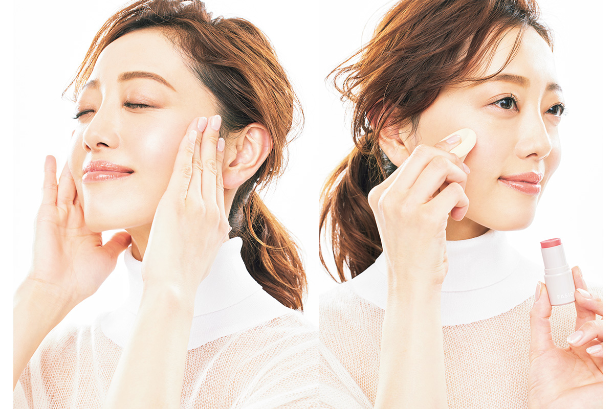 左/「たっぷり水分を与えた肌にメーク下地を下から上へ引き上げるように薄く伸ばします」右/「練りチークはスポンジにとってなじませると自然な血色感が出せます。その後にお粉をのせるとふんわりした仕上がりに」