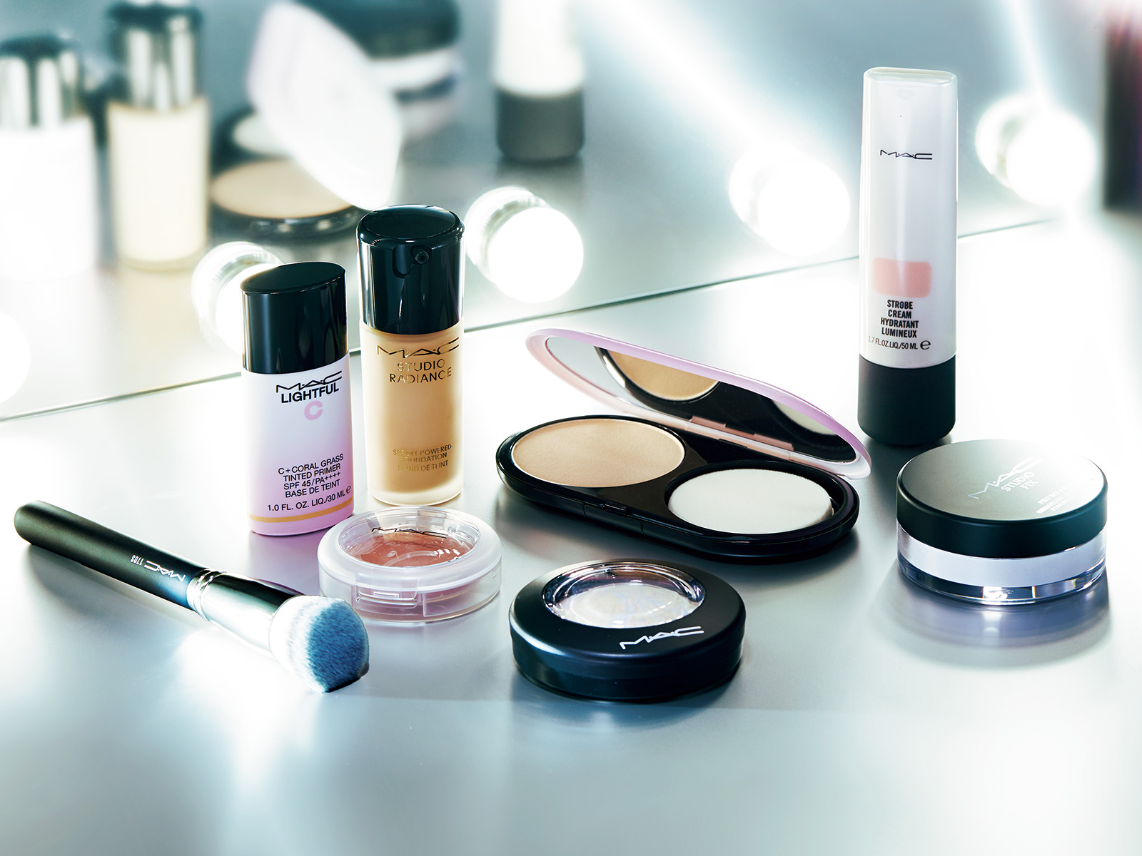 左から:《プロ仕様のマルチブラシ》#170 シンセティック ラウンド スラント ブラシ¥6,930《桜色フィルターでトーンアップ》肌補整もUV防御も。ライトフル C+ ティンティッドプライマー SPF45・PA++++ ¥6,270《リングライト級のツヤを実現》ツヤを纏うファンデ。スタジオ ラディアンス セラムファンデーション全18色 30ml ¥ 7,260《骨格メークに必須な血色を表現》独特な弾力と質感の血色チーク。グロープレイブラッシュソーナチュラル¥4,950《SNSで話題沸騰 通称〝ライスカ〟》光を創るマーブル模様のハイライトパウダー。M・A・C ミネラライズ スキンフィニッシュ ライト スカペード 10g ¥5,940《アジア特有の湿度に応じた日本処方ファンデ》ランウェイで輝く肌を再現。ライトフル C3 ナチュラル シルクパウダー ファンデーション SPF15 全 9色 SPF15・PA++ ¥7,810 ※ケース込み《プロの愛用者多数超ロングセラー!》生命感ある輝きを全身に纏って。ストロボクリーム全4色 50ml ¥6,050《乾きにくくテカりづらいステージ発想パウダー》テカりを抑えつつツヤを保つパウダー。スタジオ フィックス プロセット ブラールースパウダー全5色 6.5g ¥5,390