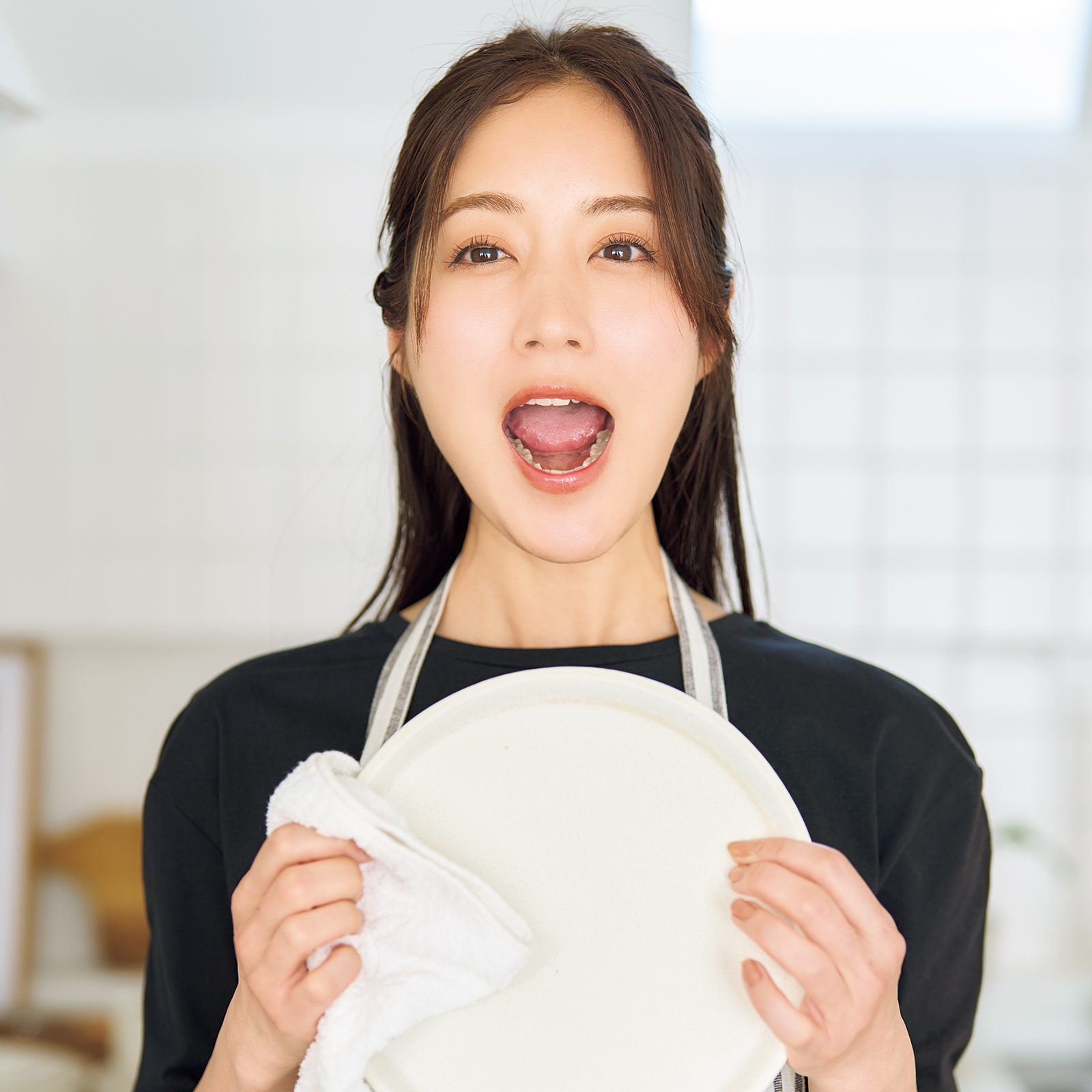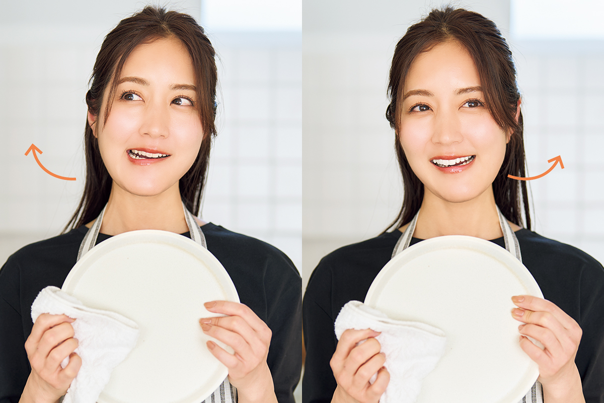 料理中やお皿洗い中に、ながらで頰の内側の筋肉を伸ばして小顔ケアを。あごを左右にゆっくり動かし10往復。あごの関節がしっかり動いていることを感じて。さらにあごを前に突き出して戻すを10回繰り返します。あごを前に突き出した状態から口を大きく開いて3秒キープします。