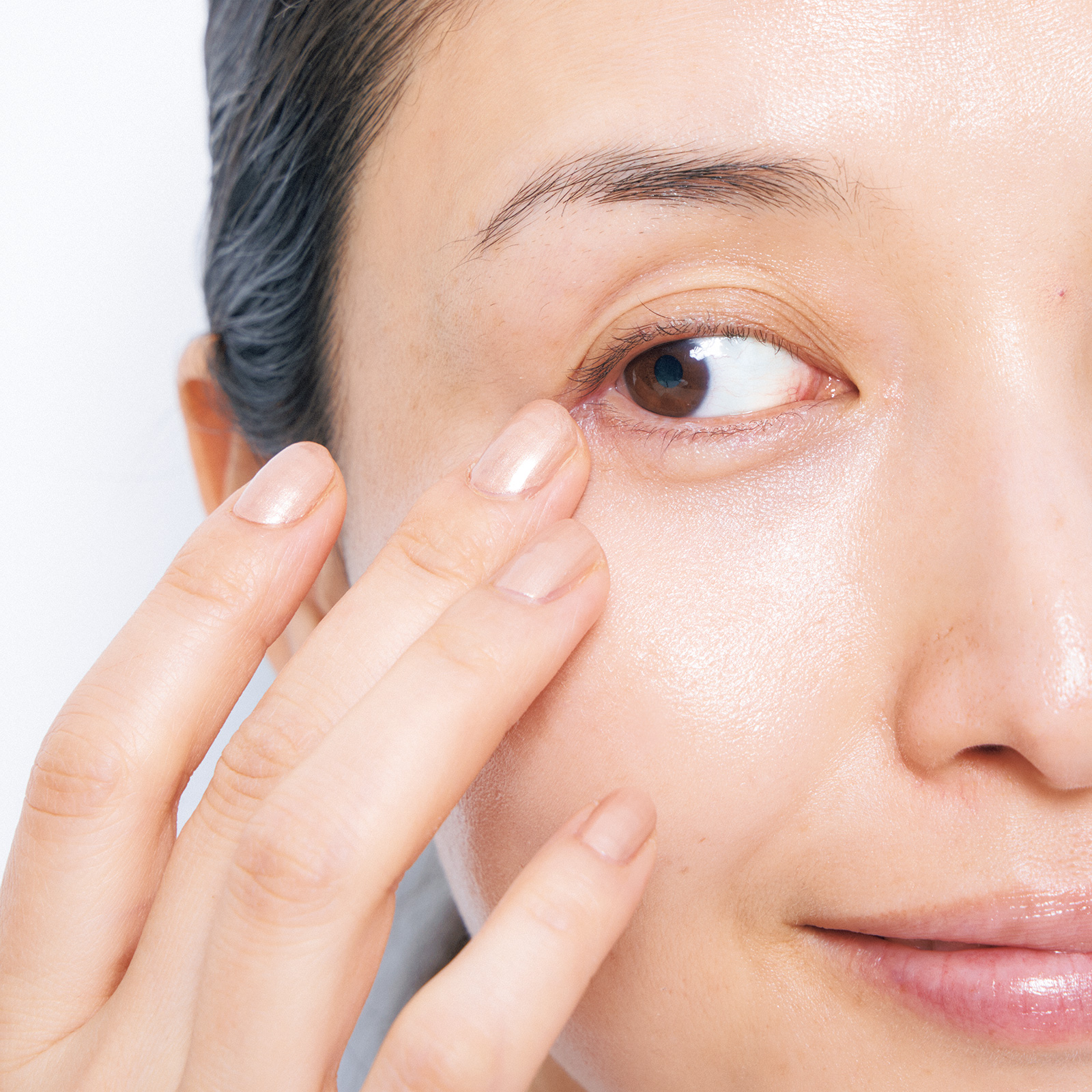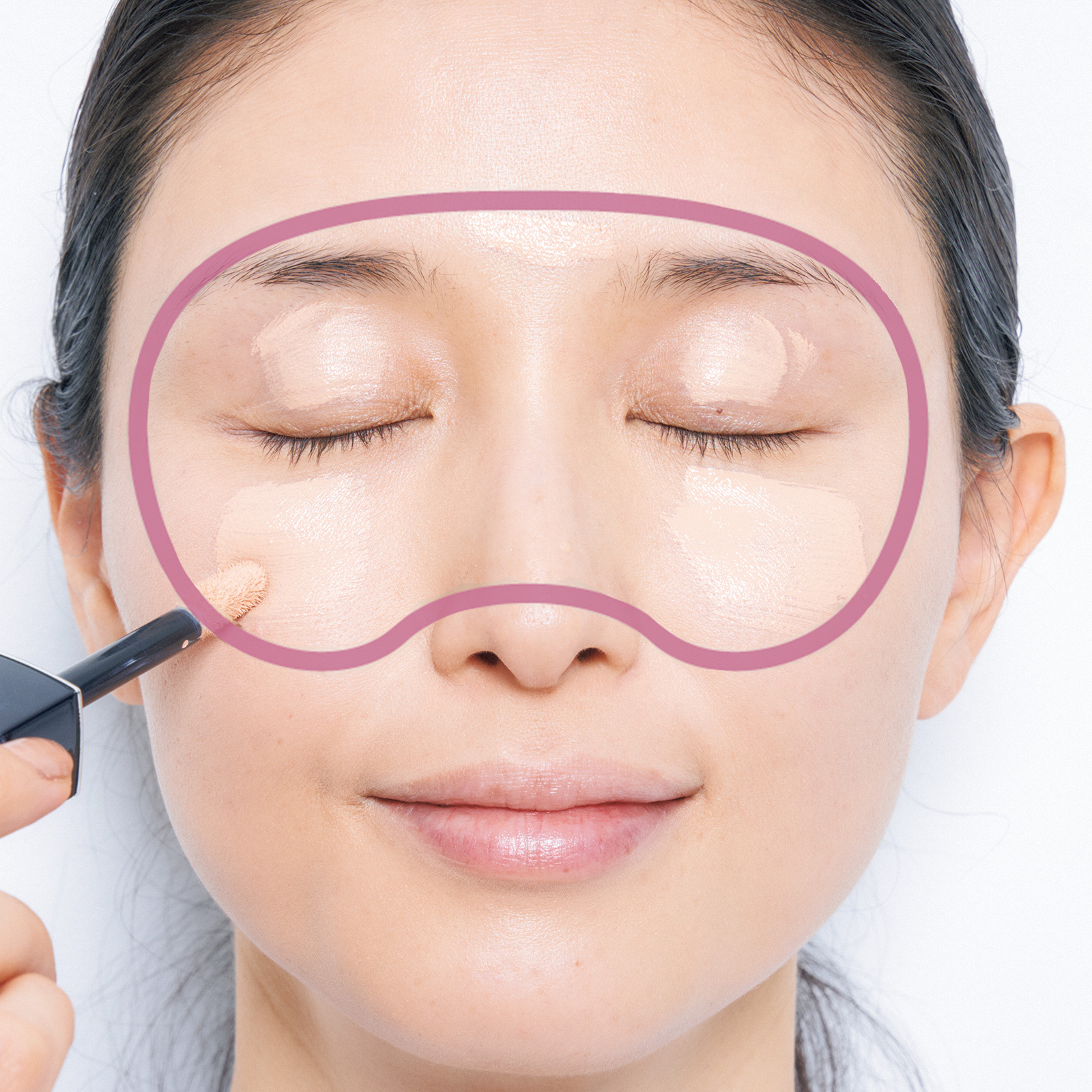 肌色と同系のみずみずしいテクスチャーのコンシーラーを選んだら、目まわりのゴーグルゾーンに色を置きます。ピンポイントすぎるとムラに見える可能性も。