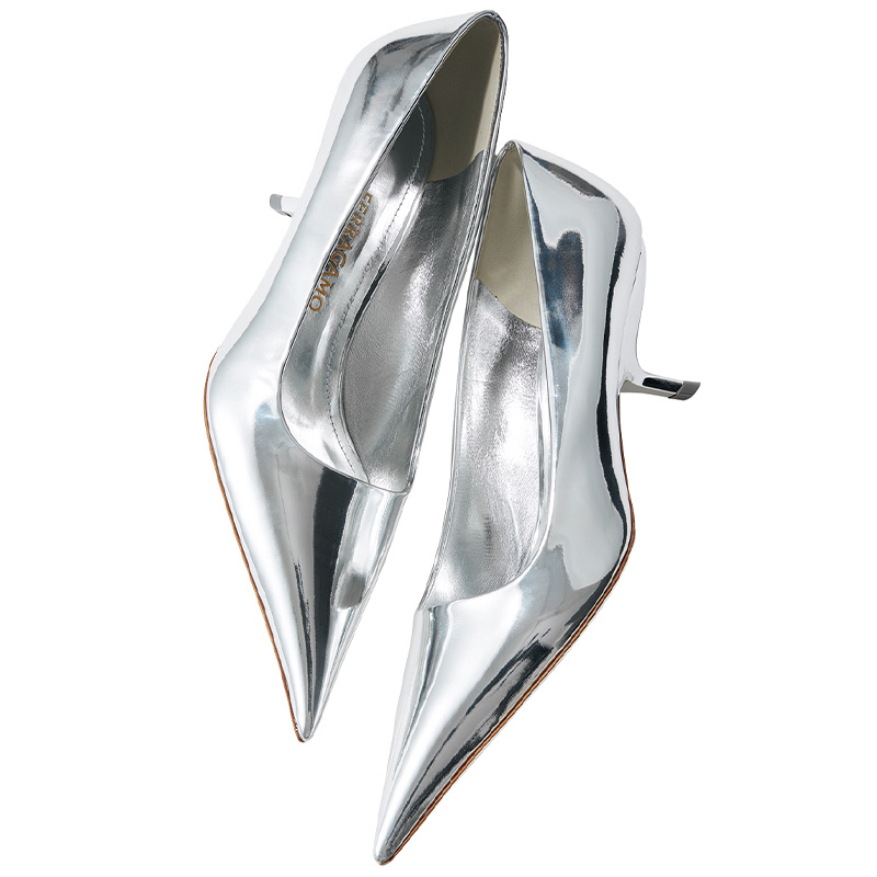 今季は、ぺたんこ靴一辺倒だったママもトライしたくなる、低ヒールシューズが豊富!攻めたカラーやデザインなら、歩きやすさとウキウキ感を両得できます。今回は、フェラガモのシルバーパンプスに注目します。