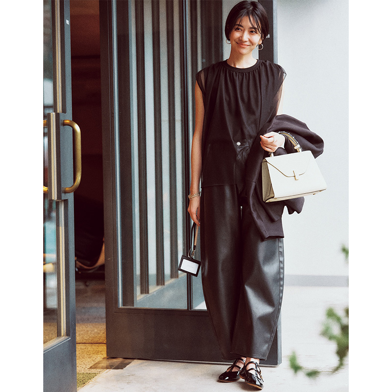 シューズ¥121,000[予定価格](セリーヌ バイエディ・スリマン/セリーヌ ジャパン)ブラウス¥9,350(ドレステリア/ドレステリア 渋谷スクランブルスクエア店)パンツ¥24,200(アンド アールシー/カレンソロジー 二子玉川)手に持ったジャケット¥35,200(セテンス)ピアス¥30,800(マリハ)リング¥16,500(イン ムード/フォーティーン ショールーム)ブレスレット¥66,000(ブランイリス/ブランイリストーキョー)バッグ¥588,500ハンドルカバー¥73,700(ともにヴァレクストラ/ヴァレクストラ ジャパン)その他/スタイリスト私物