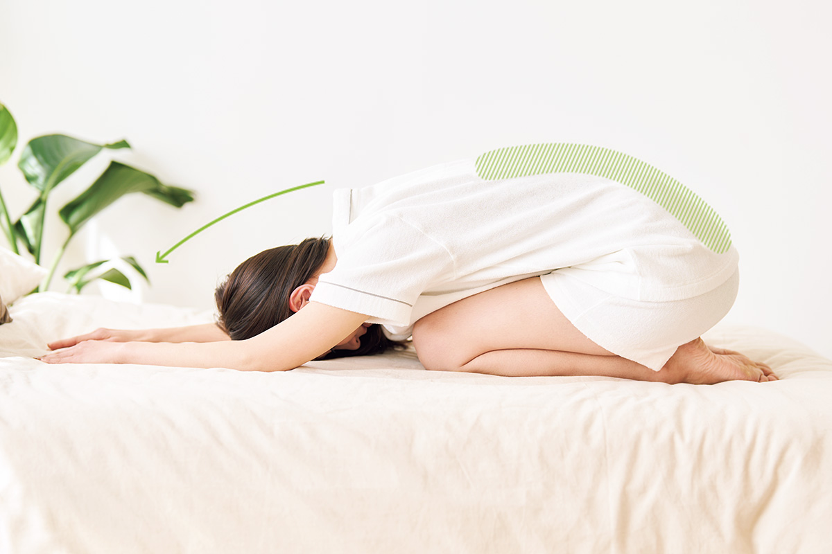 正座で座り息を吐きながら、手のひらを下に腕を伸ばし前かがみになり、首・肩・背中・腰が気持ちよく伸びるのを感じます。ゆっくり呼吸をしながら30~60秒キープ。太ももでお腹にほどよい圧がかかるため腸に刺激を与え便秘対策にもなる、朝にぴったりなストレッチ。